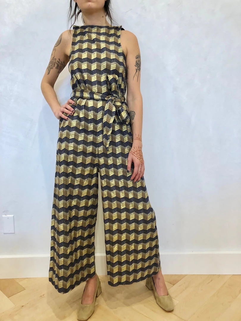 Overall-style one piece with a bib front and button straps. features a wide, cropped leg and a fabric belt.