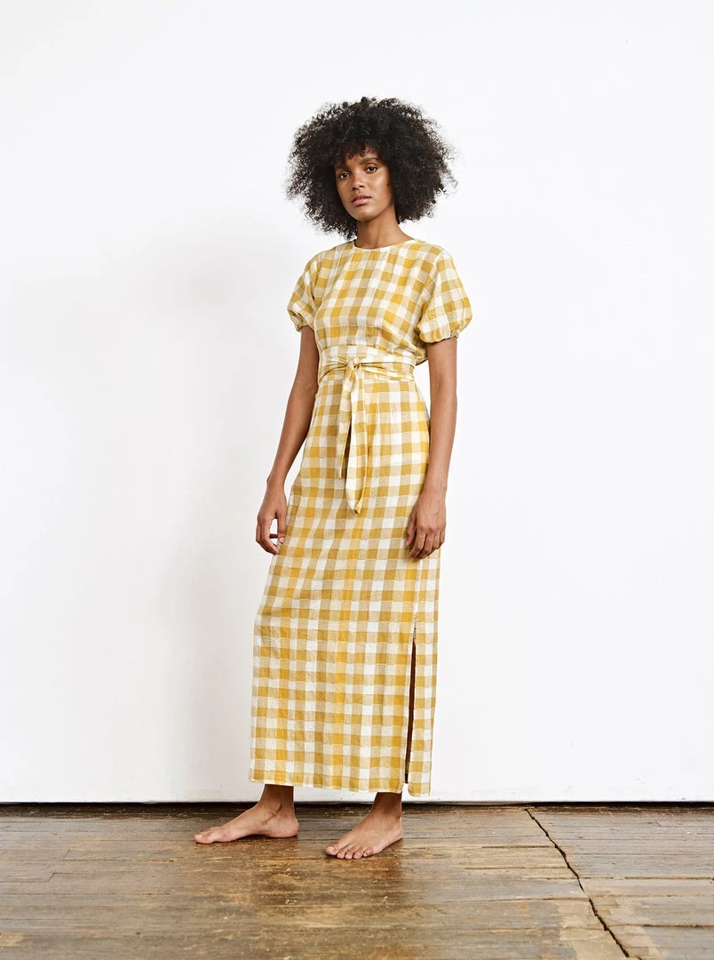 The Georgie Dress is a straight short sleeve maxi dress with a front button placket, gently elasticated sleeve openings, a side slit, and a removable fabric belt. can be worn back to front. Fez is a lightweight natural singlecloth with a faded yellow and mustard plaid and metallic accents.
