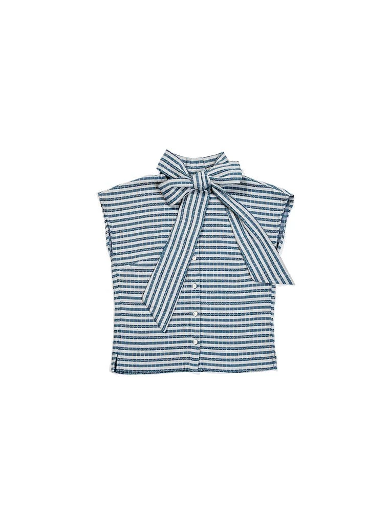 A sleeveless button up top with an extended collar that can be tied in a knot or bow. Featured here in Ace & Jig’s custom yard dye woven starboard fabric, a denim blue and natural stripe single cloth with a tiny teal twist yarn.