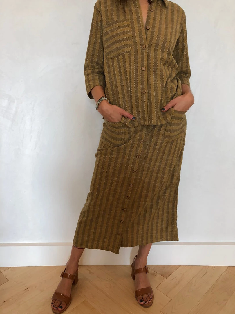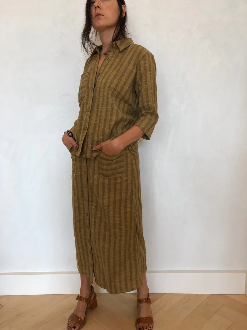 Aย button-up stand collar shirt with three-quarter length sleeves and a front patch pocket.