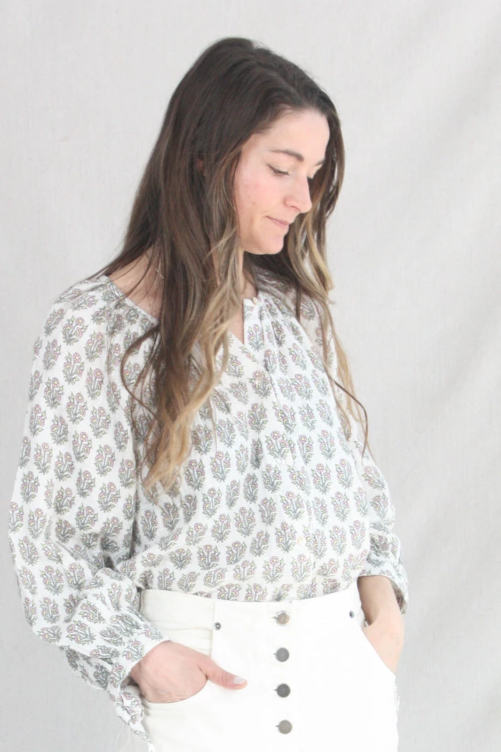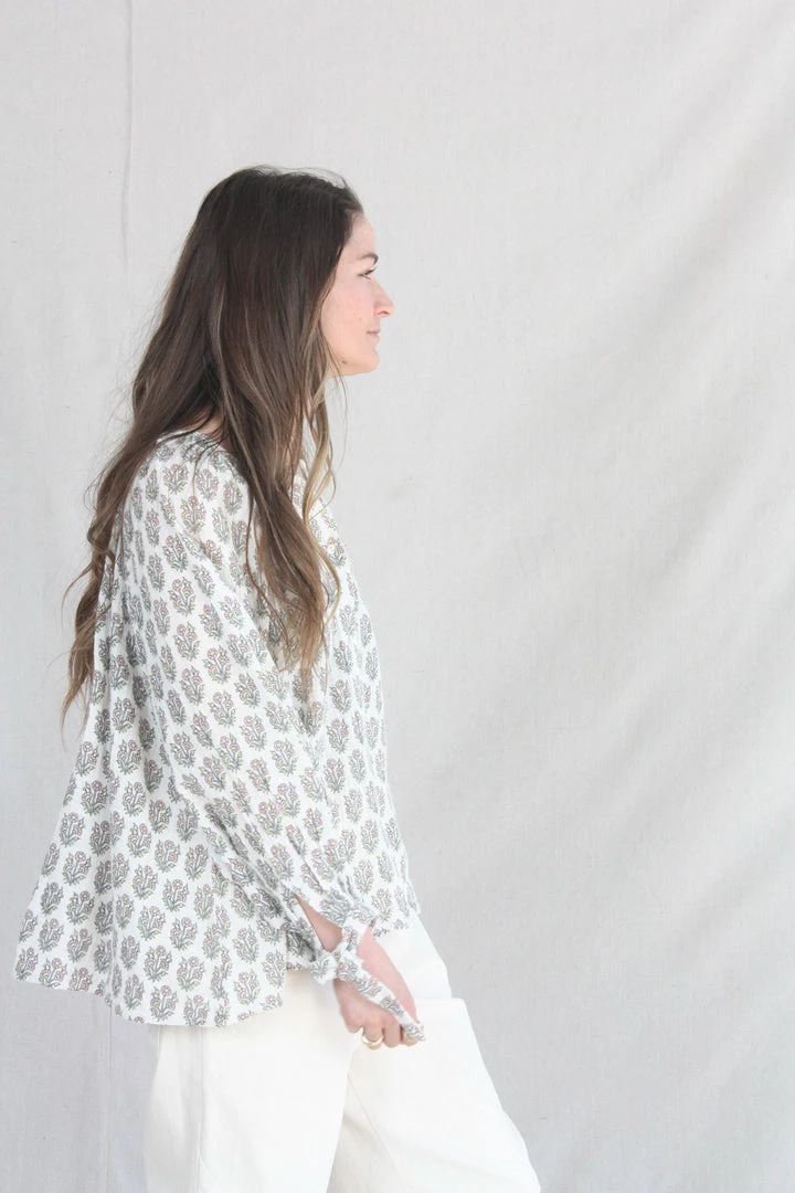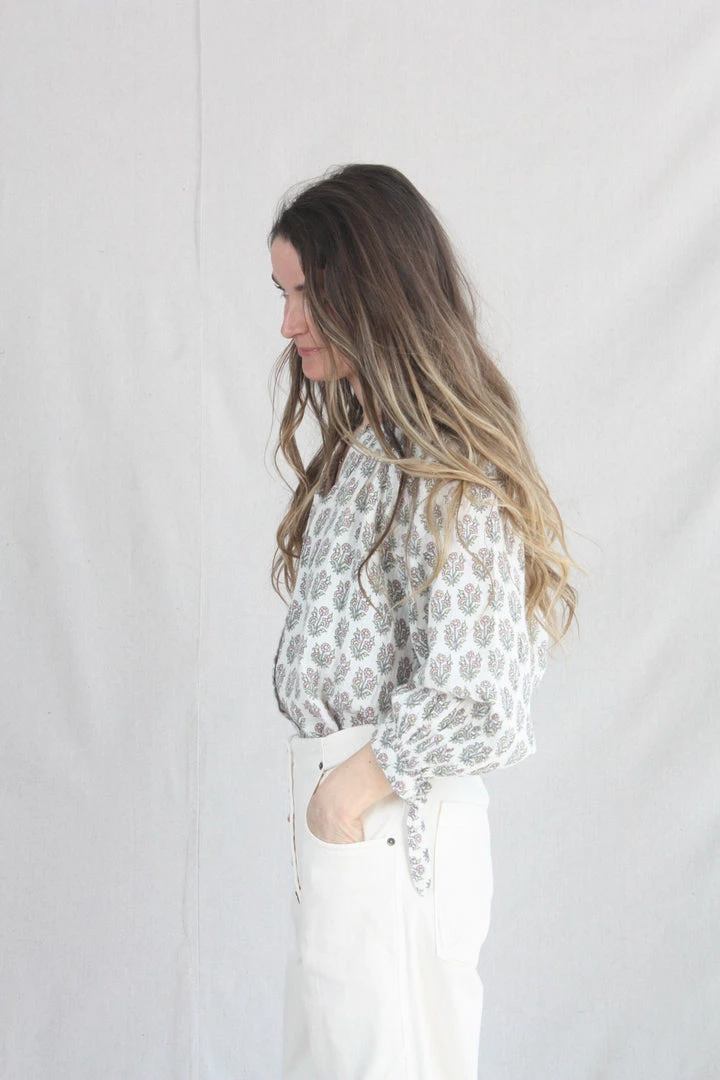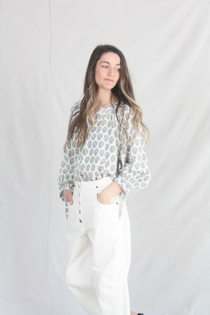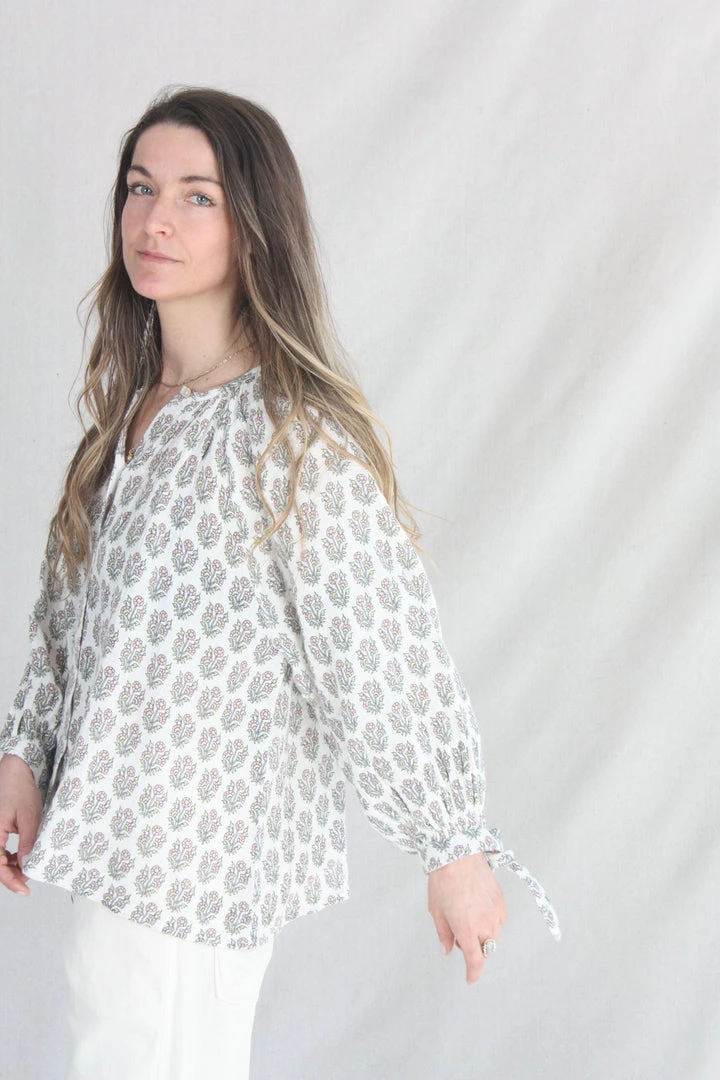 The Laila Blockprint Button Down Blouse is tailored in a soft natural double cloth cotton. This relaxed fitting blouse features a curved neck band, gathers, raglan long-sleeves with self tie cuffs and clean finish hem detail.
