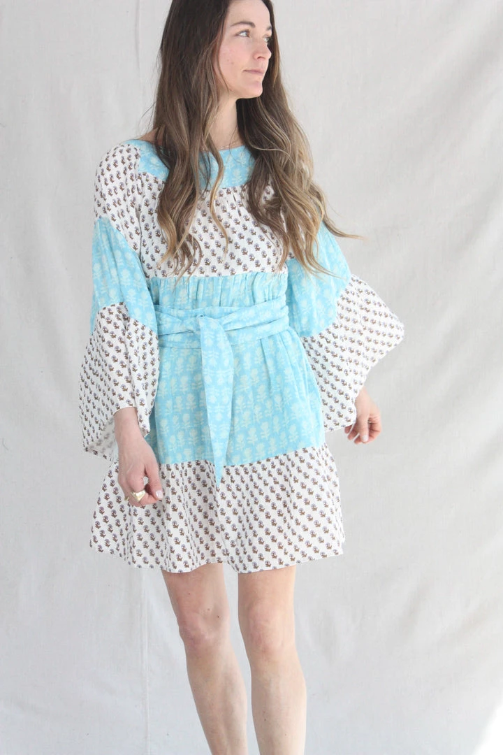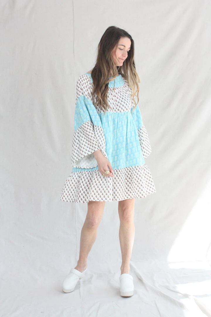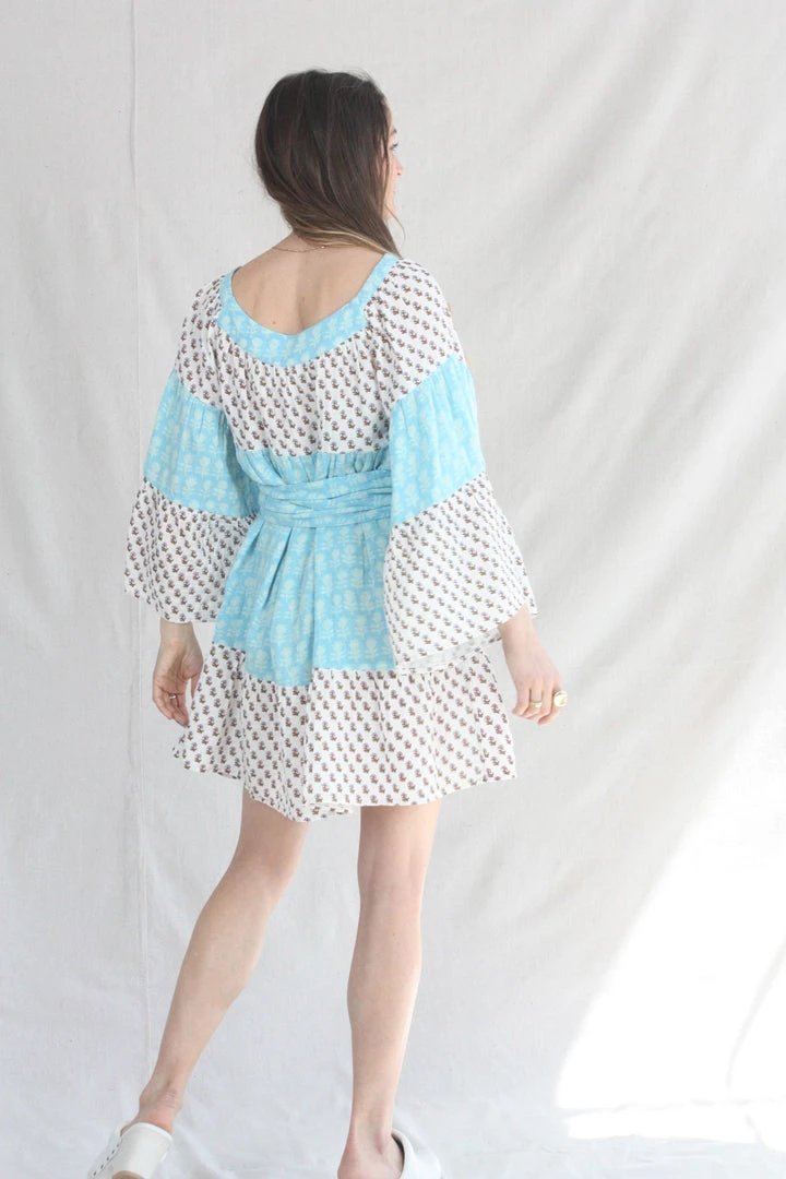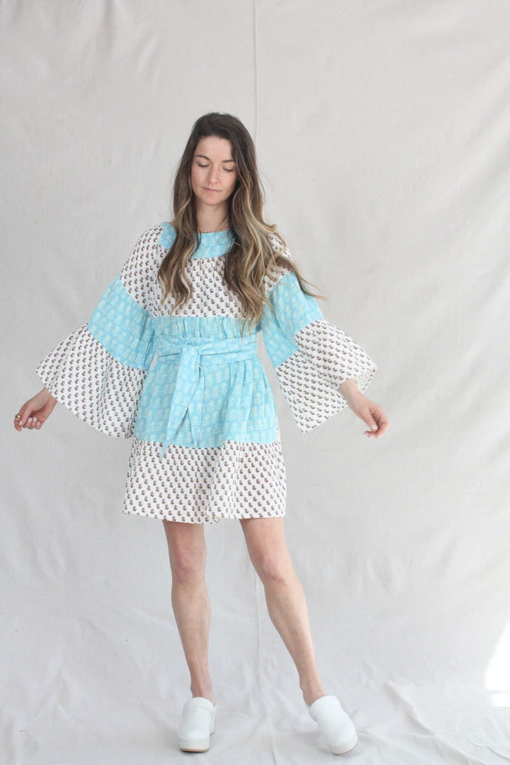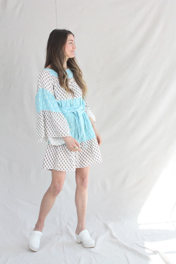 The Talitha Blockprint Mini Dress is inspired by the ’70s gypset era of languidly lounging around in the Berber Lodges of North Africa on hot, summer days. This free-flowing silhouette falls above the knees and features a high curved neckline, tiered bell sleeves, detachable self-tie belt, and ruffle tiered hem with clean finish detail.