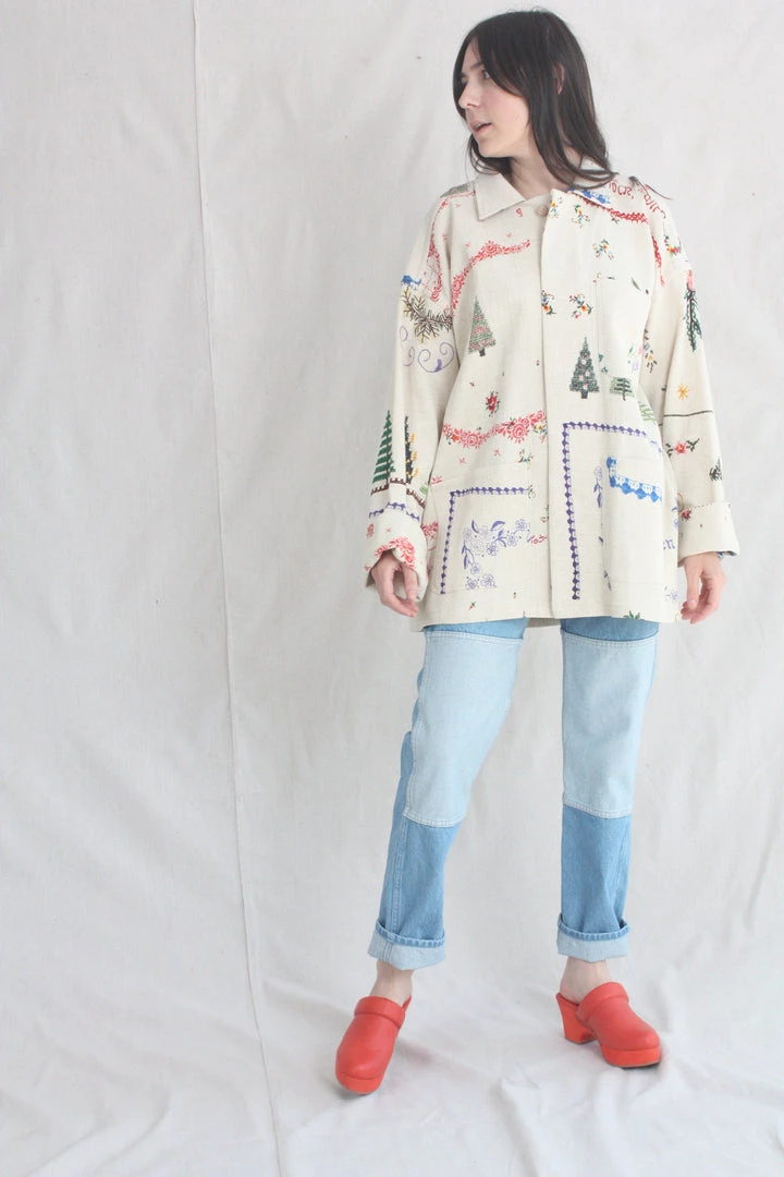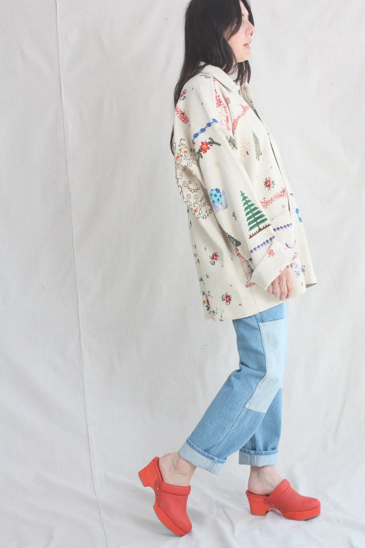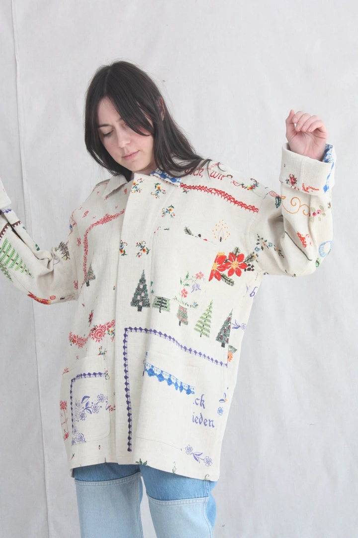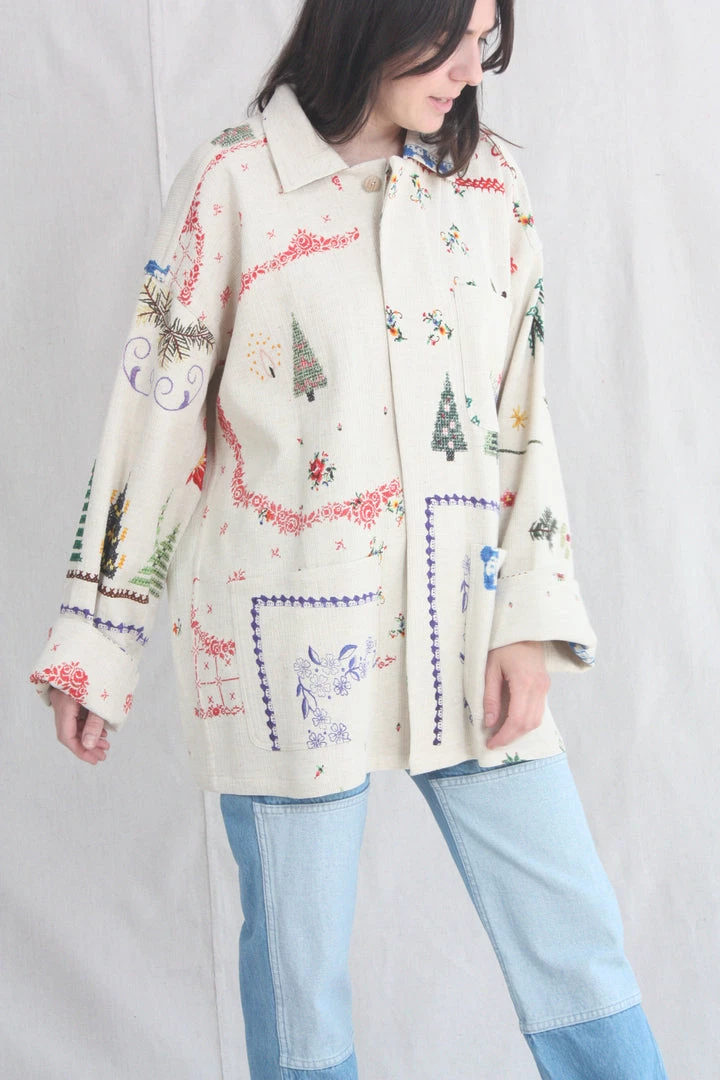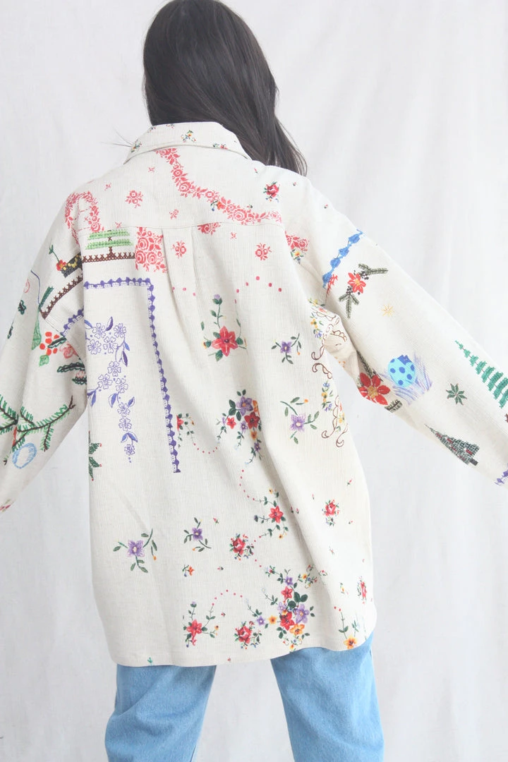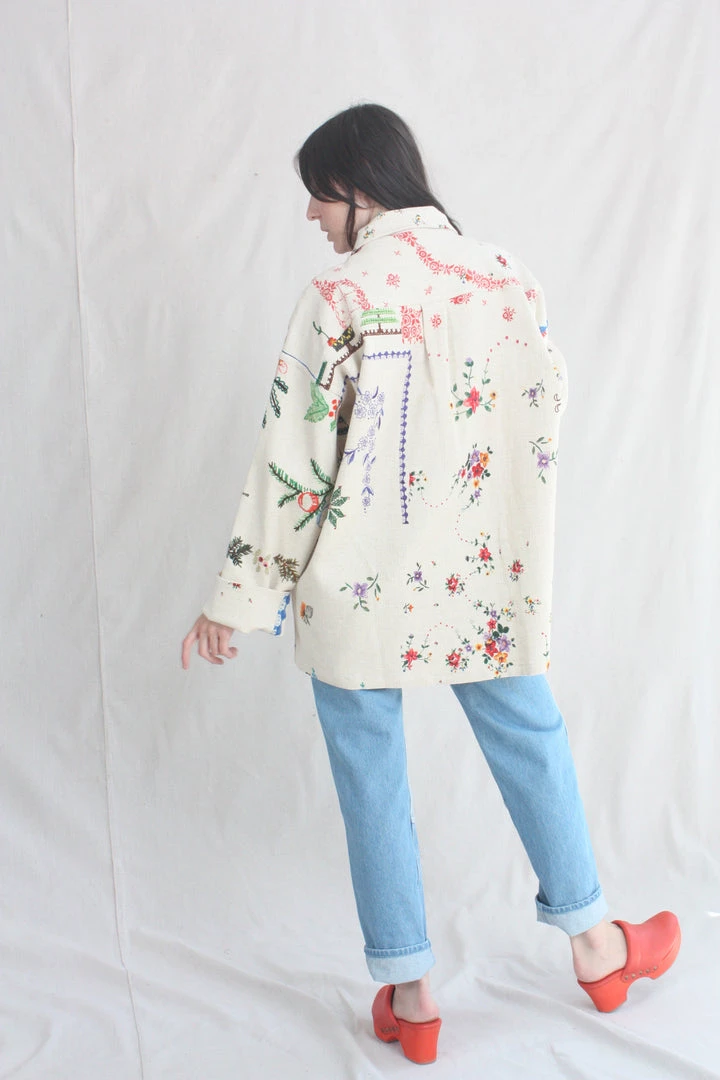 Box loose fitting jacket in a printed textured organic cotton. Collar and button front. Breast and oversized patch pockets.