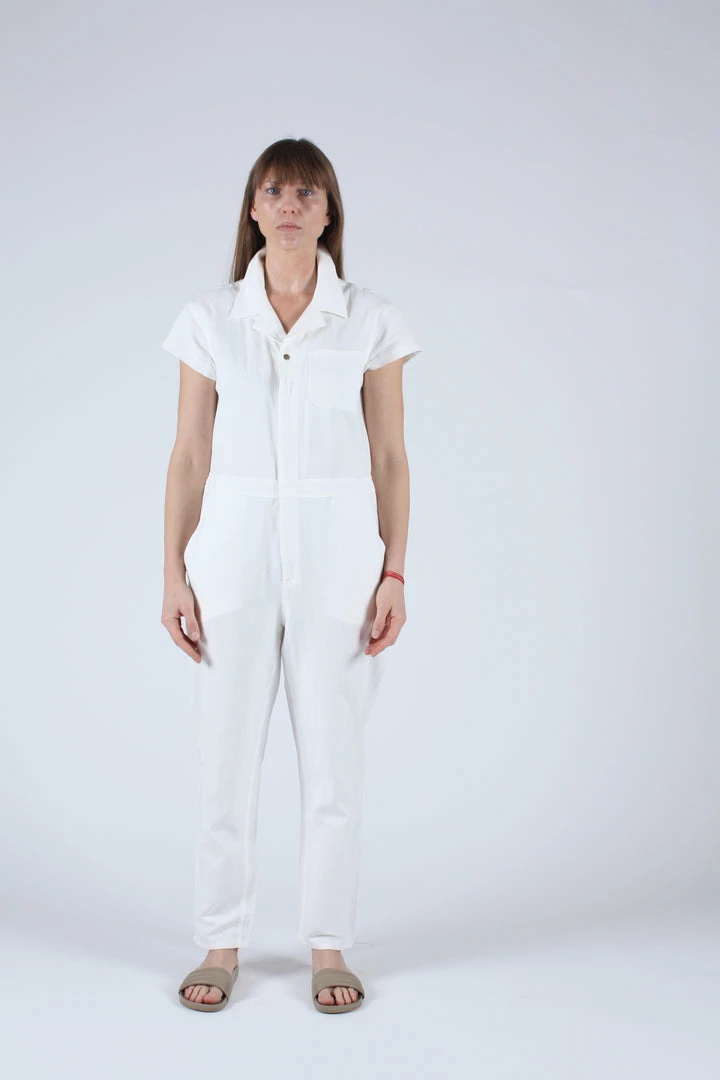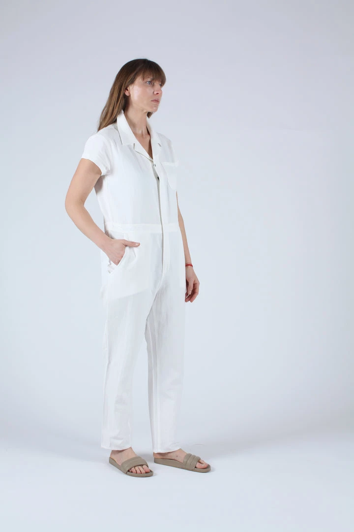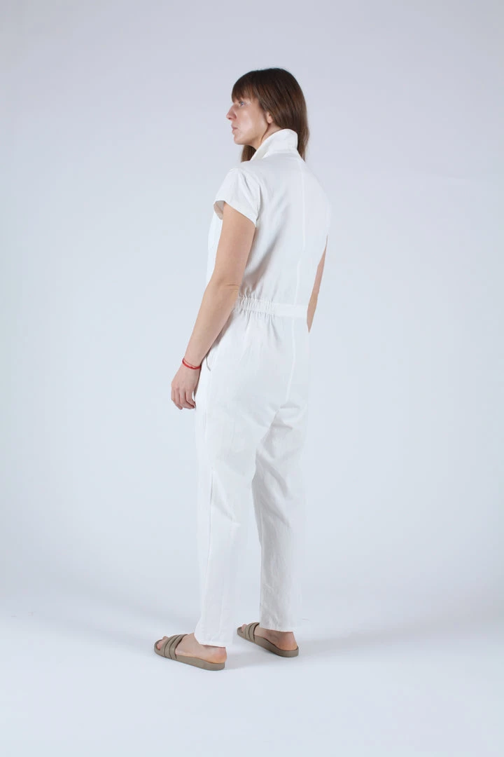 Utilitarian jumpsuit cut from a soft cotton-linen fabric with a full zip front. The waist is subtly nipped in by elastic at the back, and a cropped length.