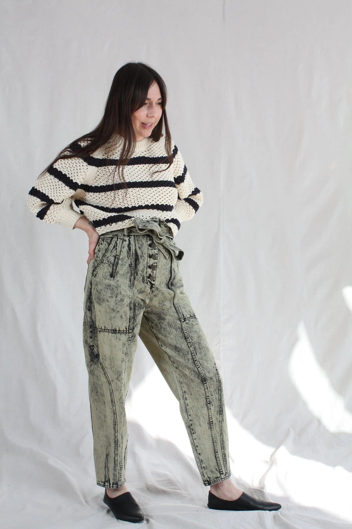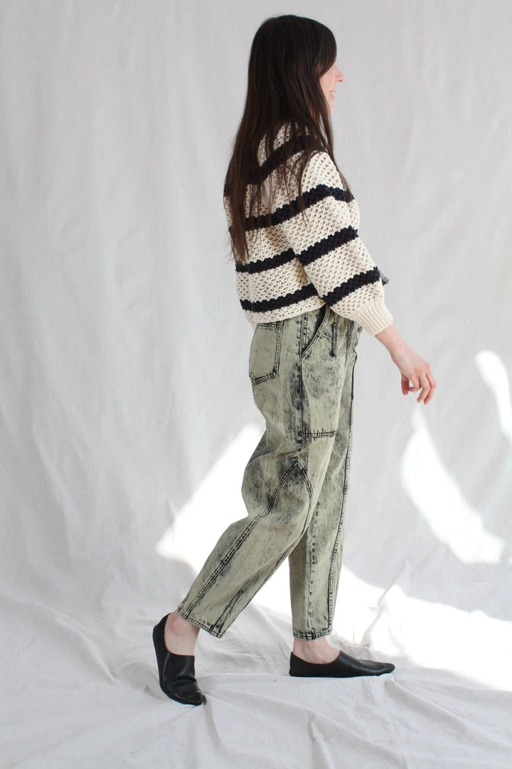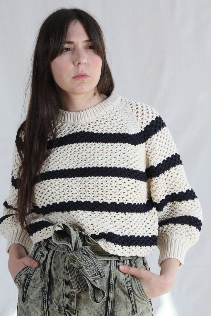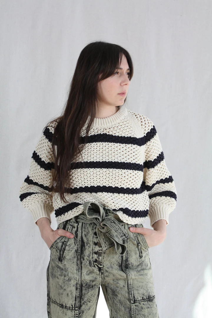 The Merel Funnel Neck Sweater is knit from a lightweight cotton blend with an easy, open weave and classic navy stripe. Cropped length with slight puff sleeve that pushes just past the elbow. Ribbed cuff and neck.