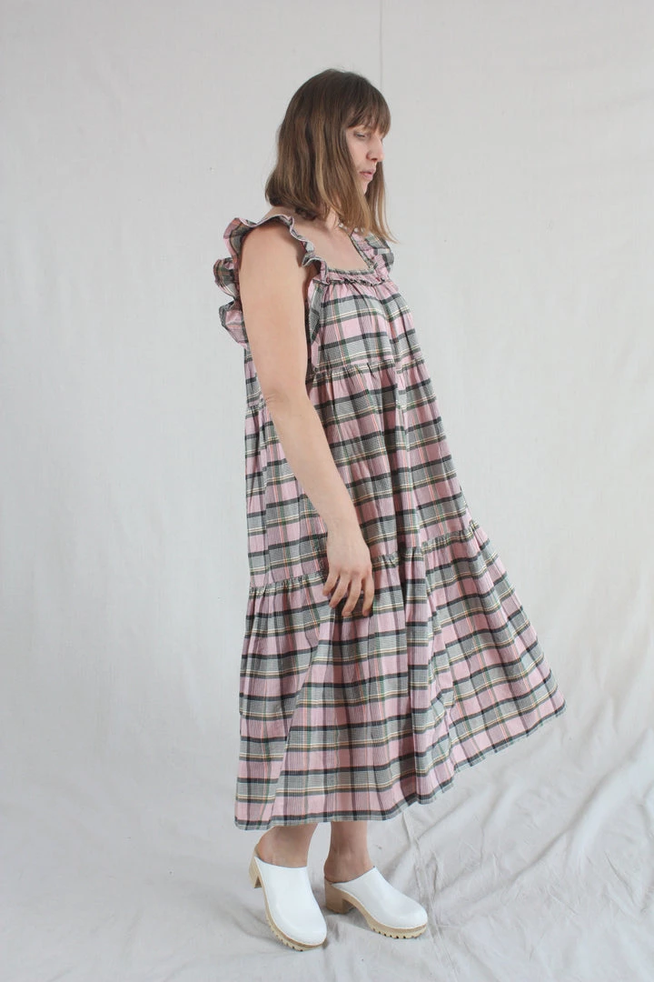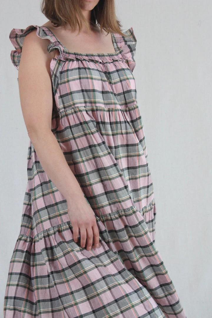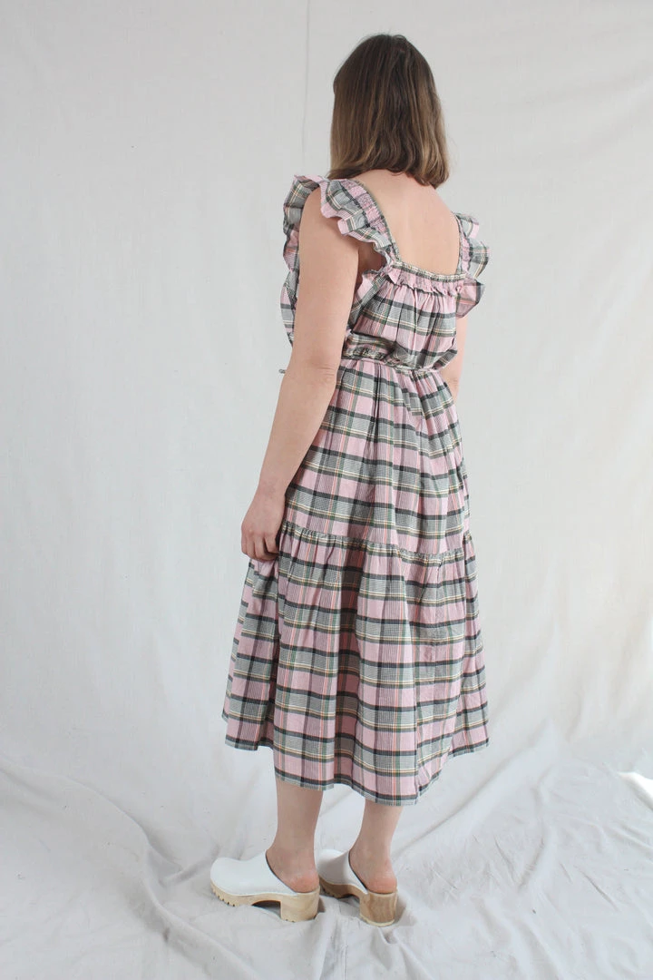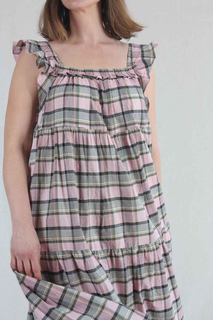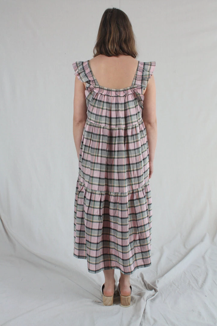 This flutter-sleeve dress has an easy, relaxed fit, midi length and a square smocked neckline with gathered tiers throughout. Cut from cool cotton in an intricately-woven Madras plaid.Â