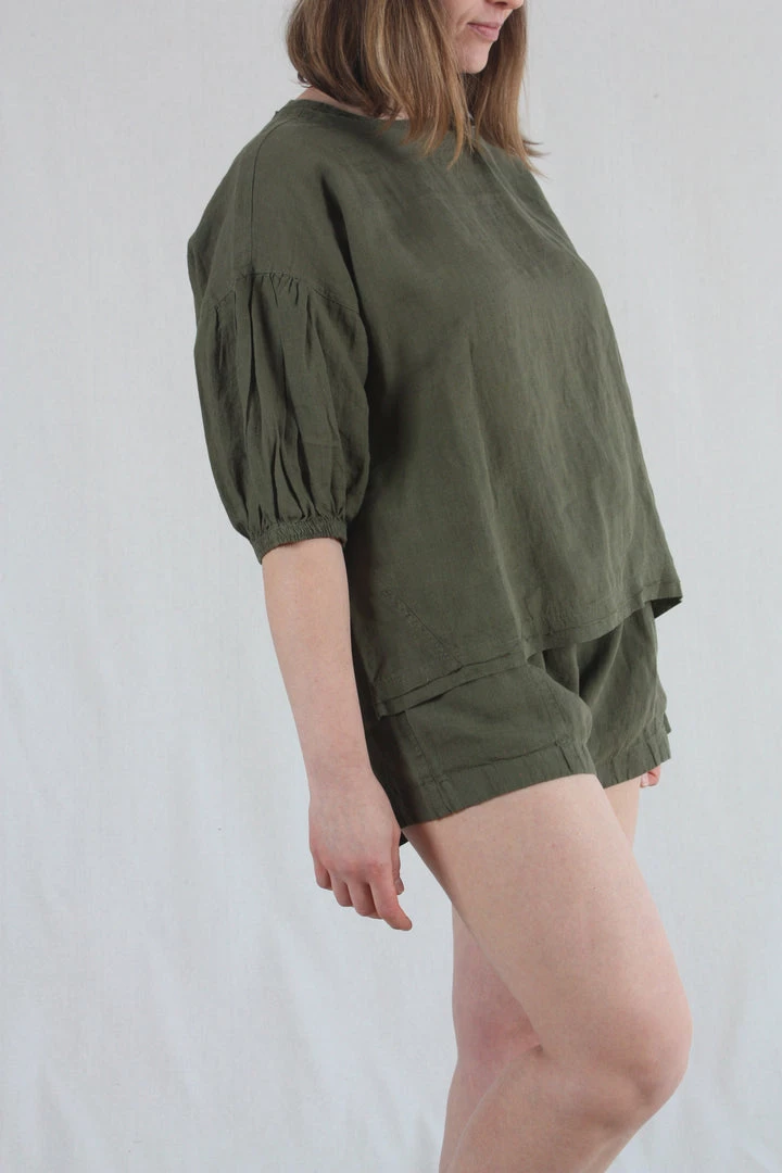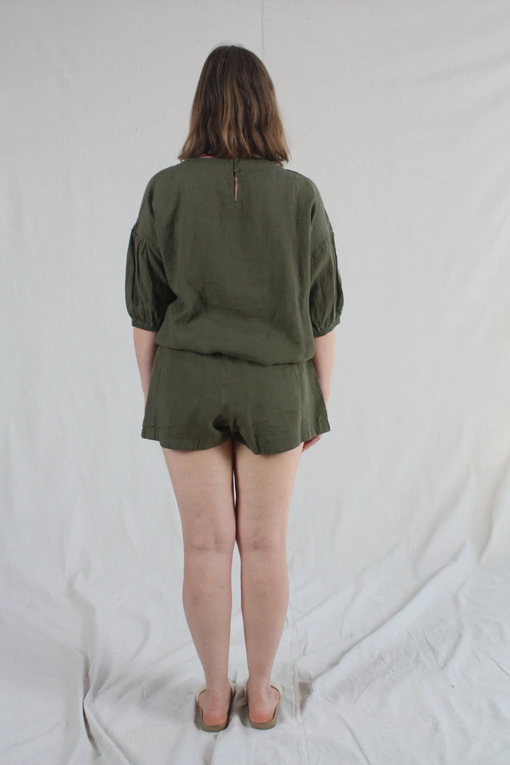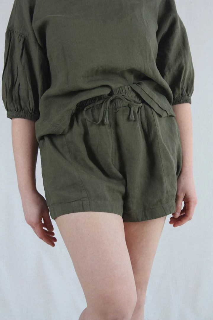 The Trail Short in a washed organic linen, crafted to wear easily from poolside to dinner table. With an elastic waistband, self-tie drawstring, roomy side-pockets and a relaxed fit, the Trail Shorts are an ideal warm-weather staple.
