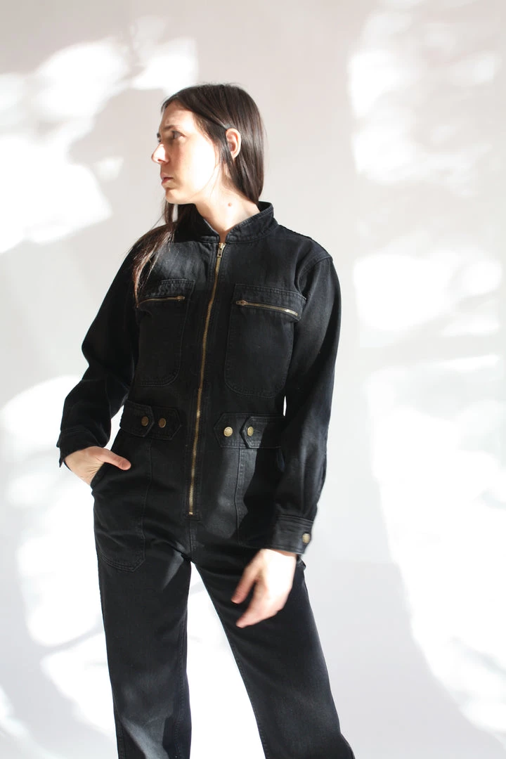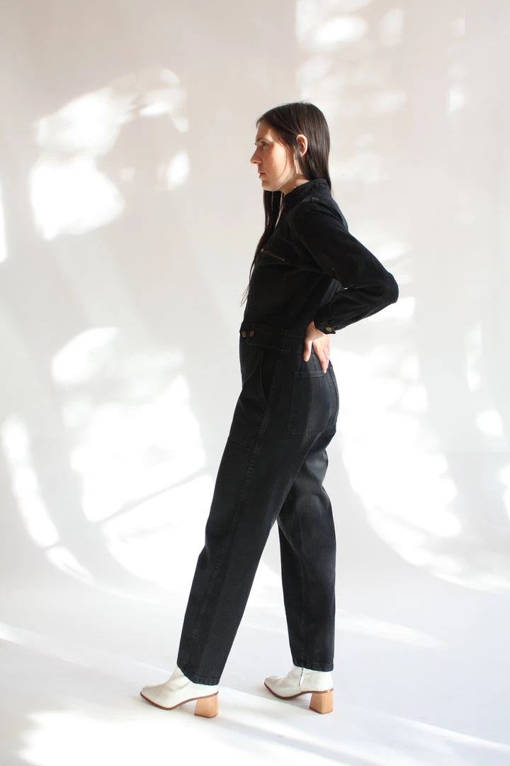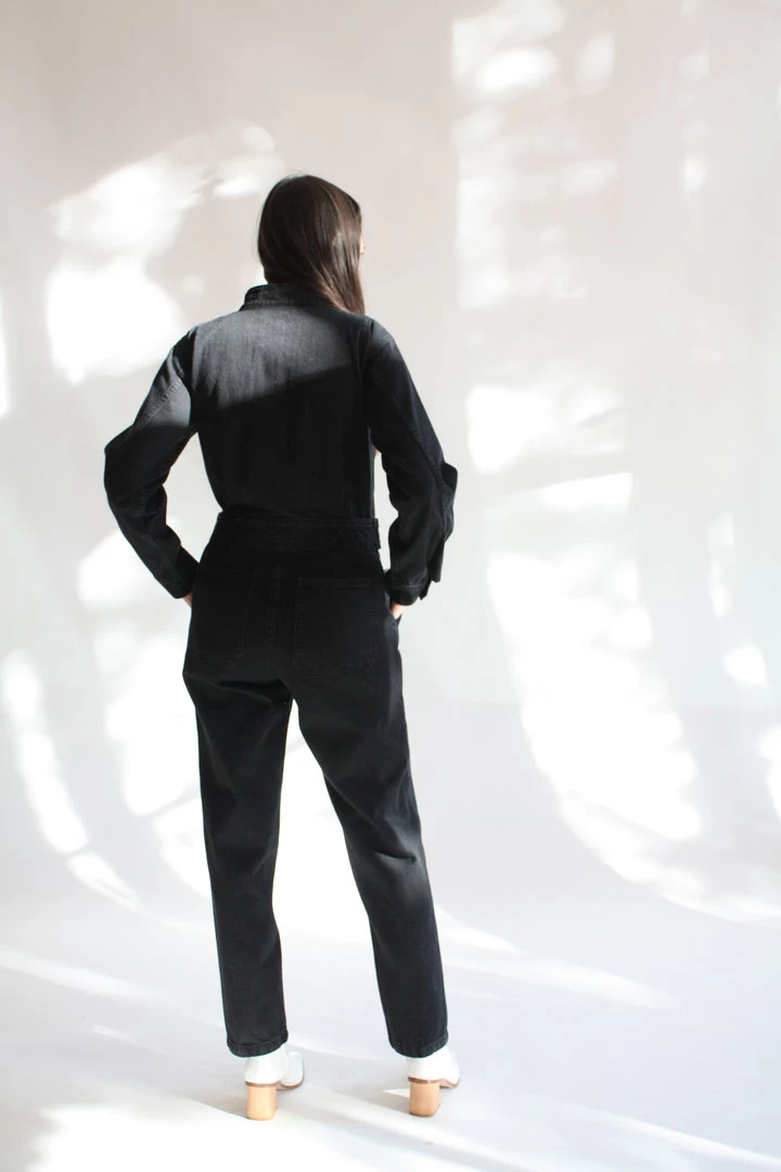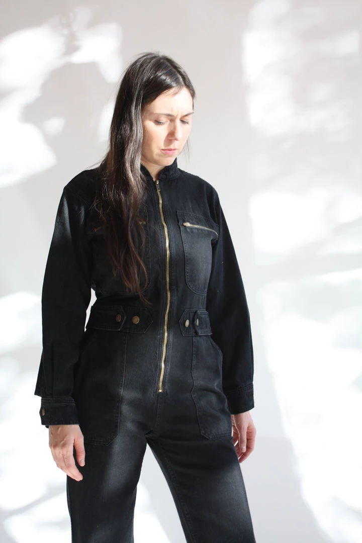 Utilitarian inspired jumpsuit in a cool washed black. Fully zipped front, deep side pockets and breast pocket detailing. Adjustable tabs at the waist allow for a customized fit.