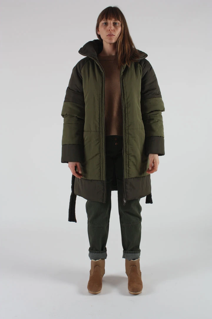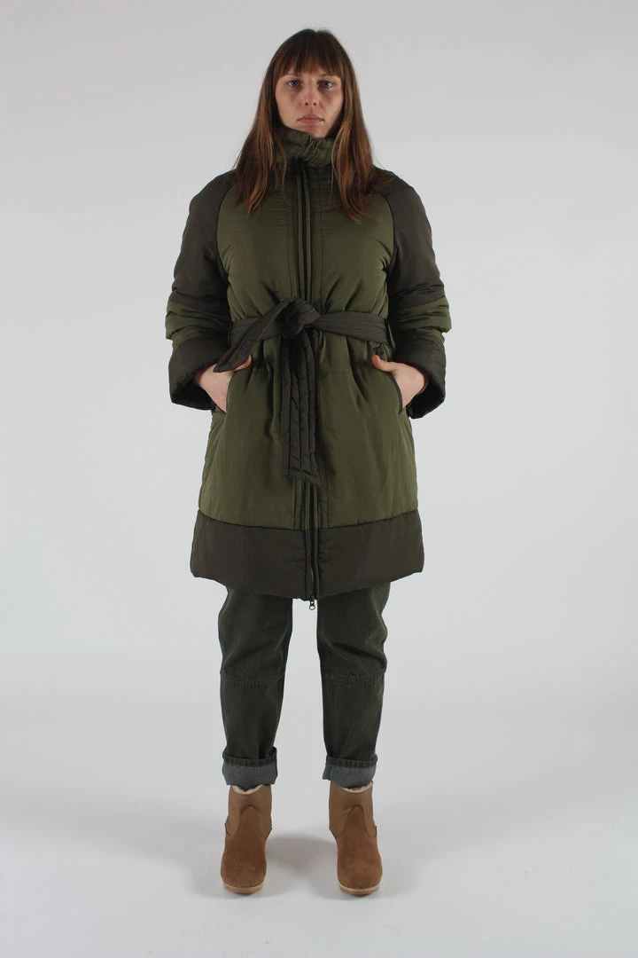 Longline silhouette, full zip front, deep pockets and an optional belt that adds definition. The quilted shell is padded to keep heat locked in, and the oversized collar perfectly deters the wind.