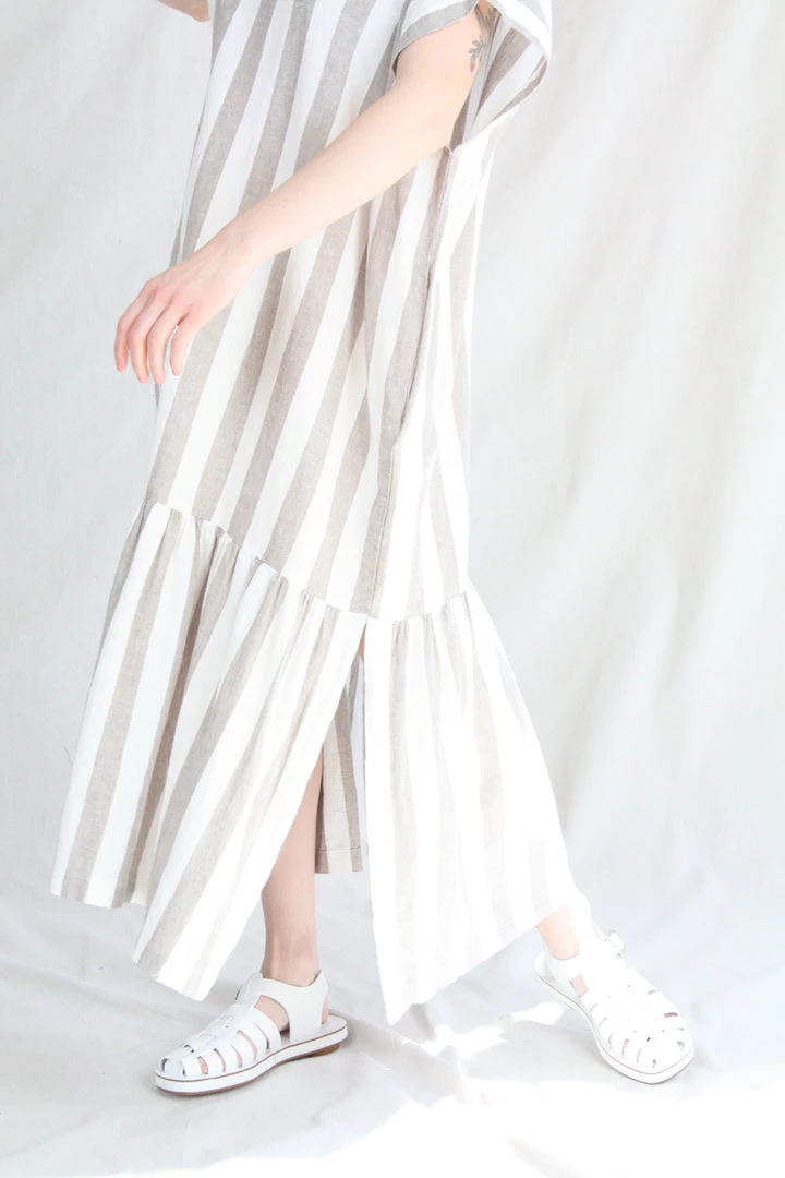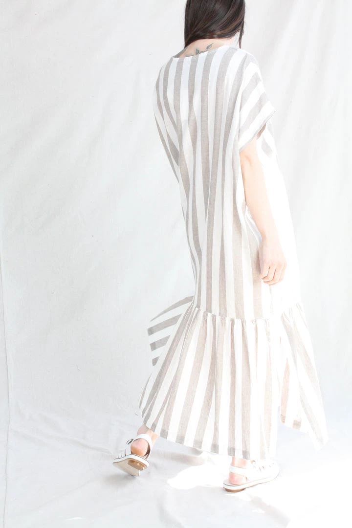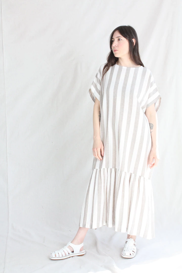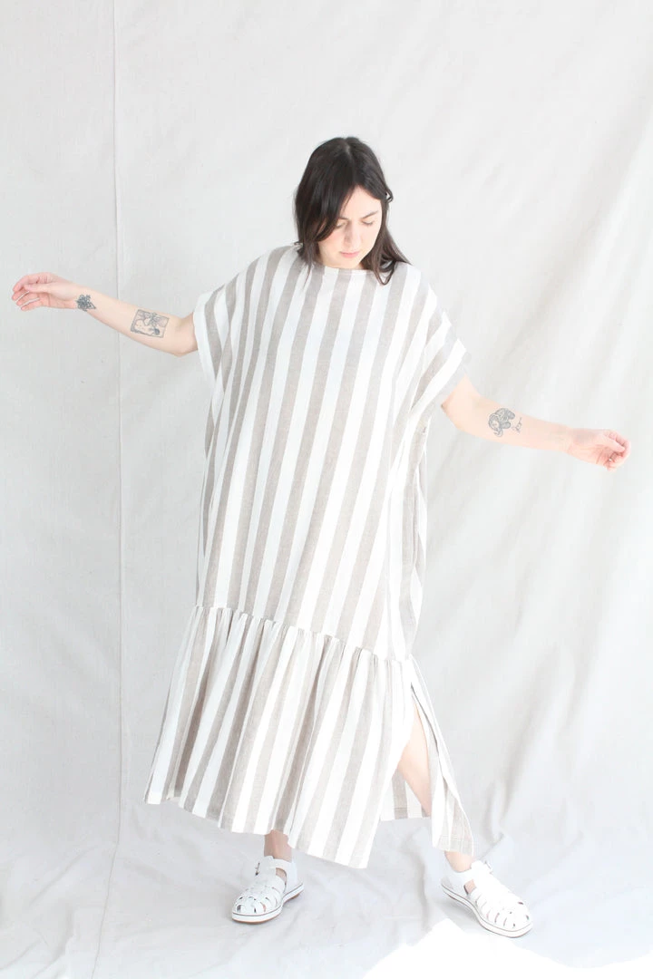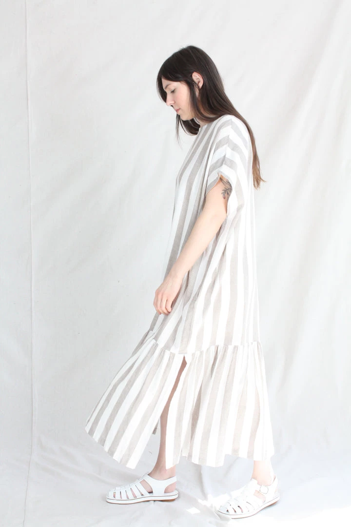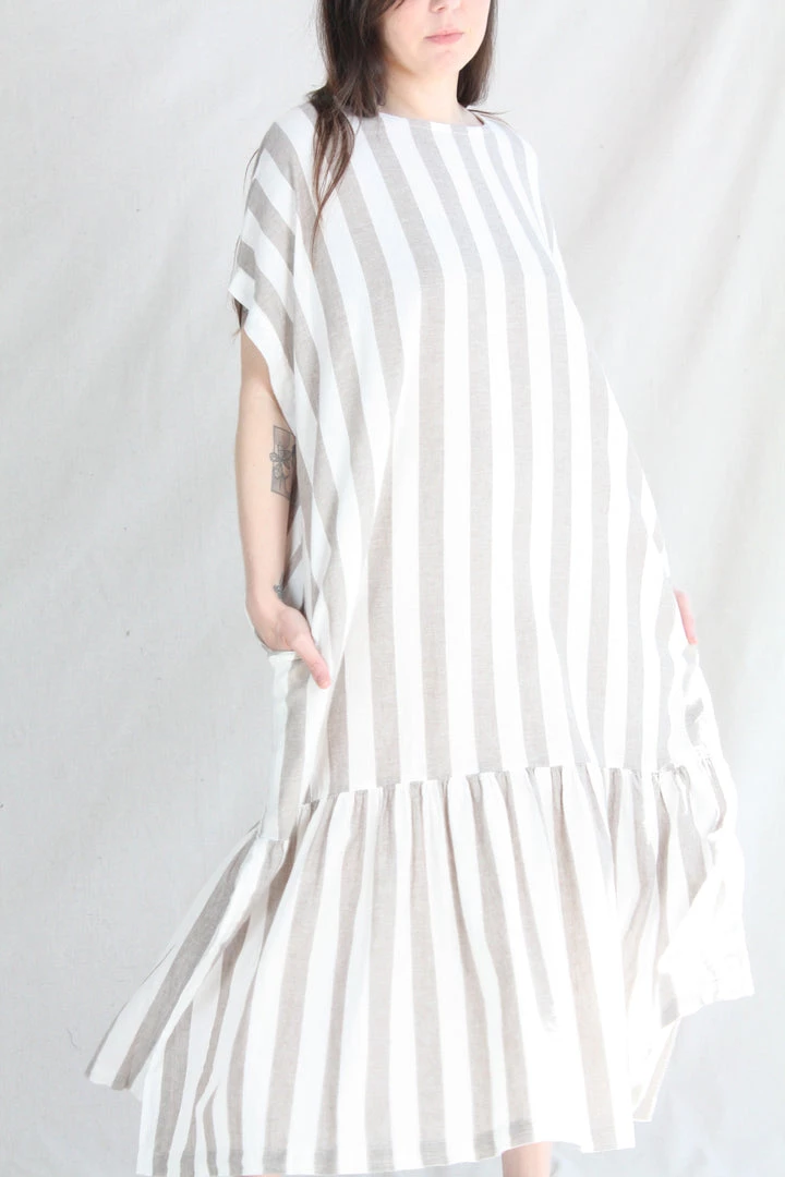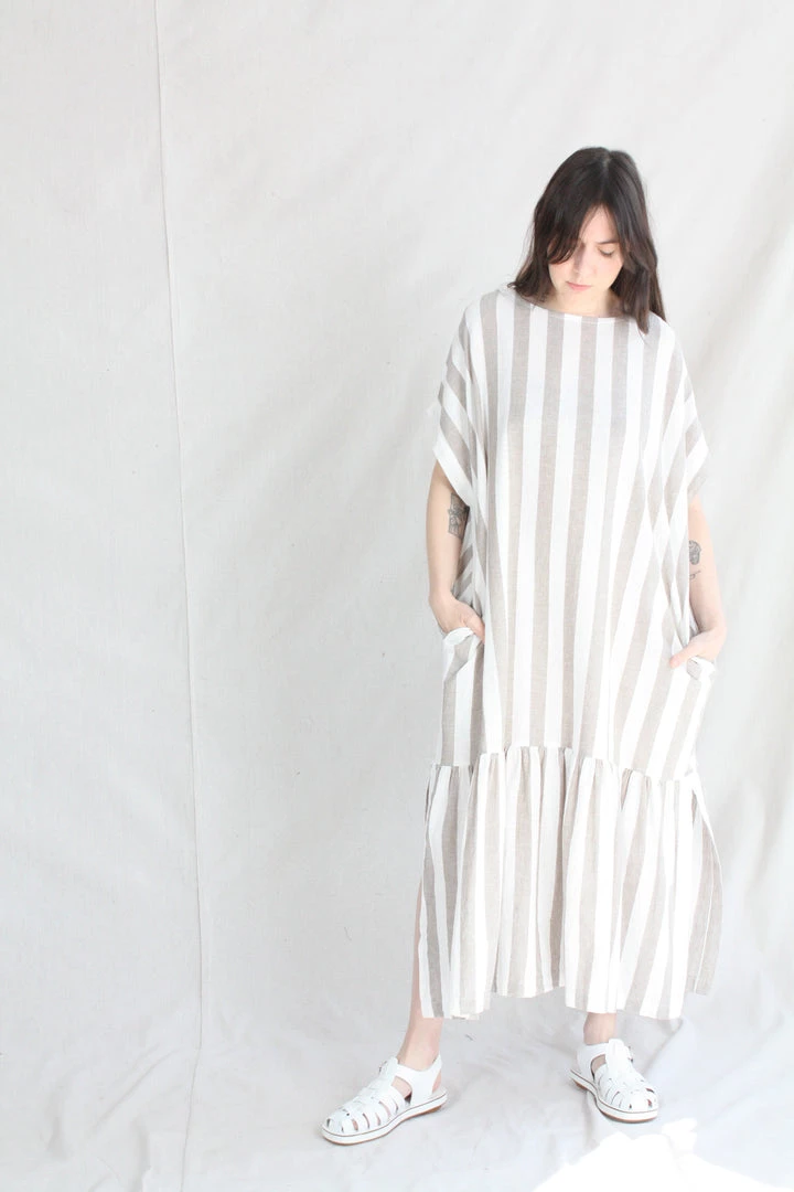 A relaxed, airy dress in a super soft wide stripe cotton, linen. Crew neck. Ruffled bottom with side slits. Side slip pockets.