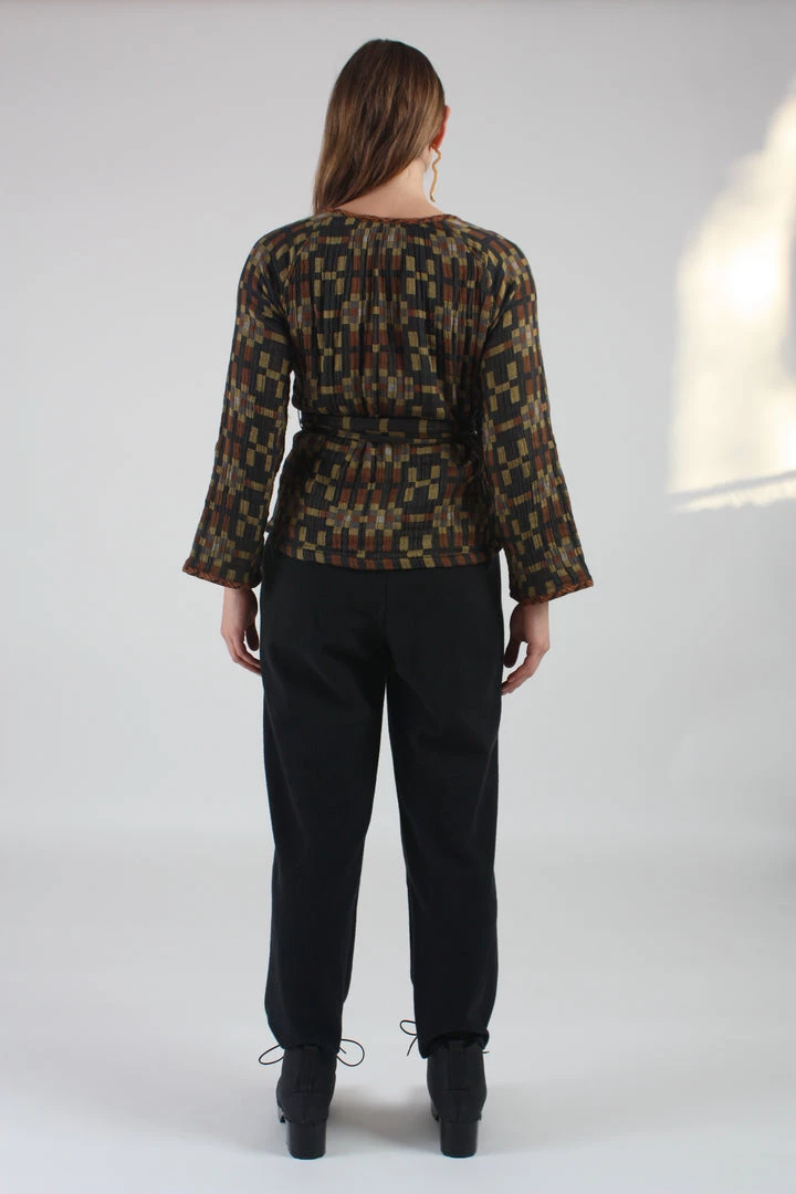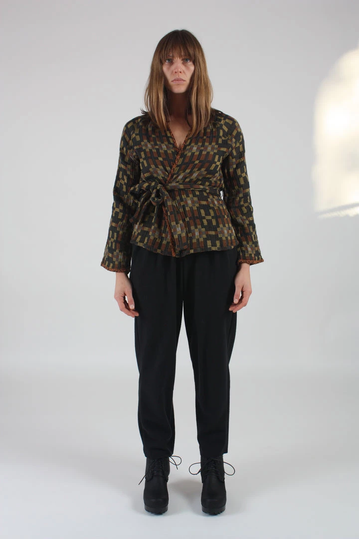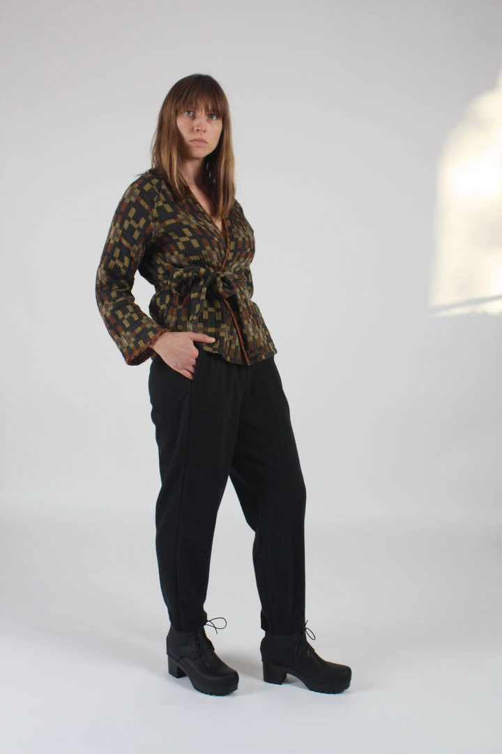 A relaxed, tapered pants with an elastic waist. Side seam pockets. Raw edge on hem with Japanese special fray prevention technology.