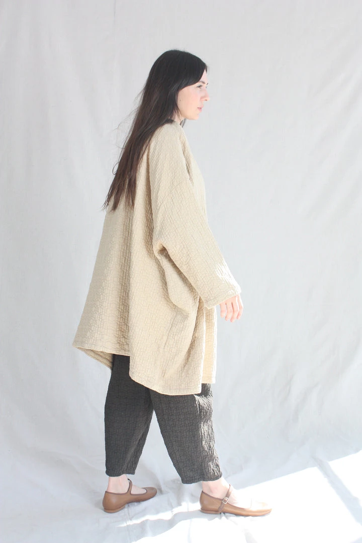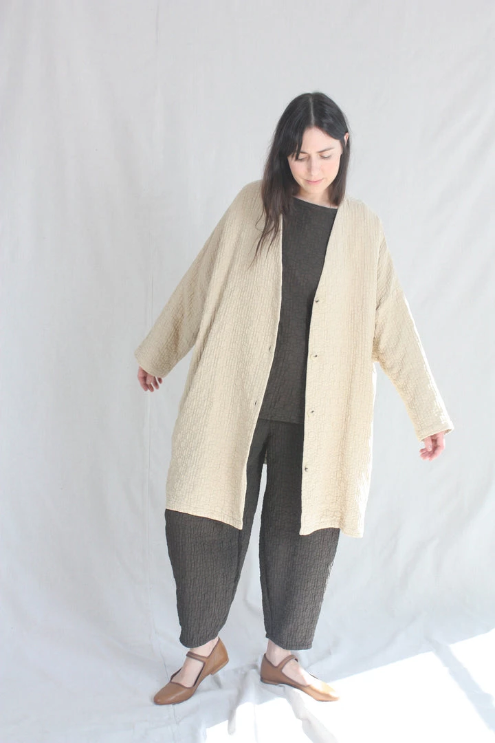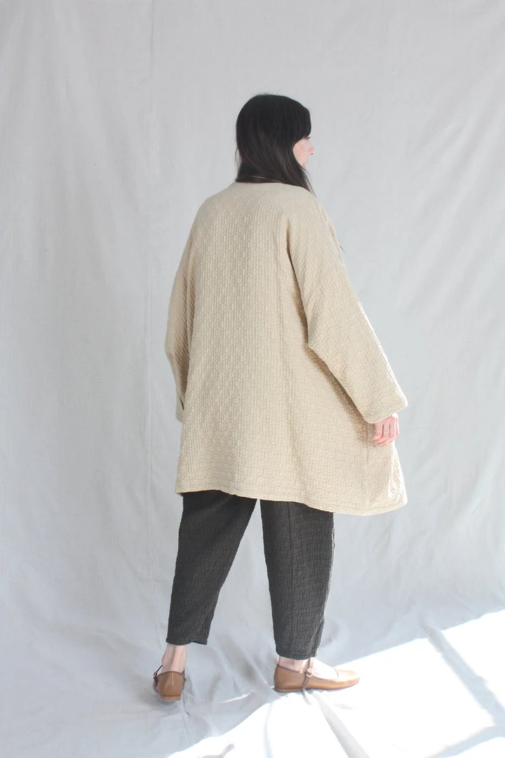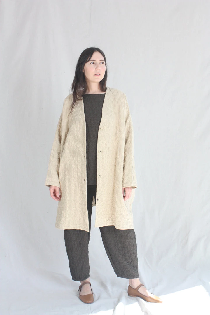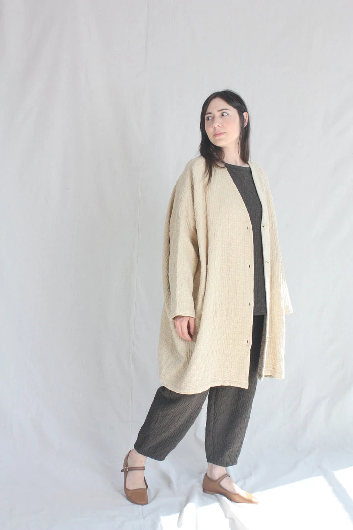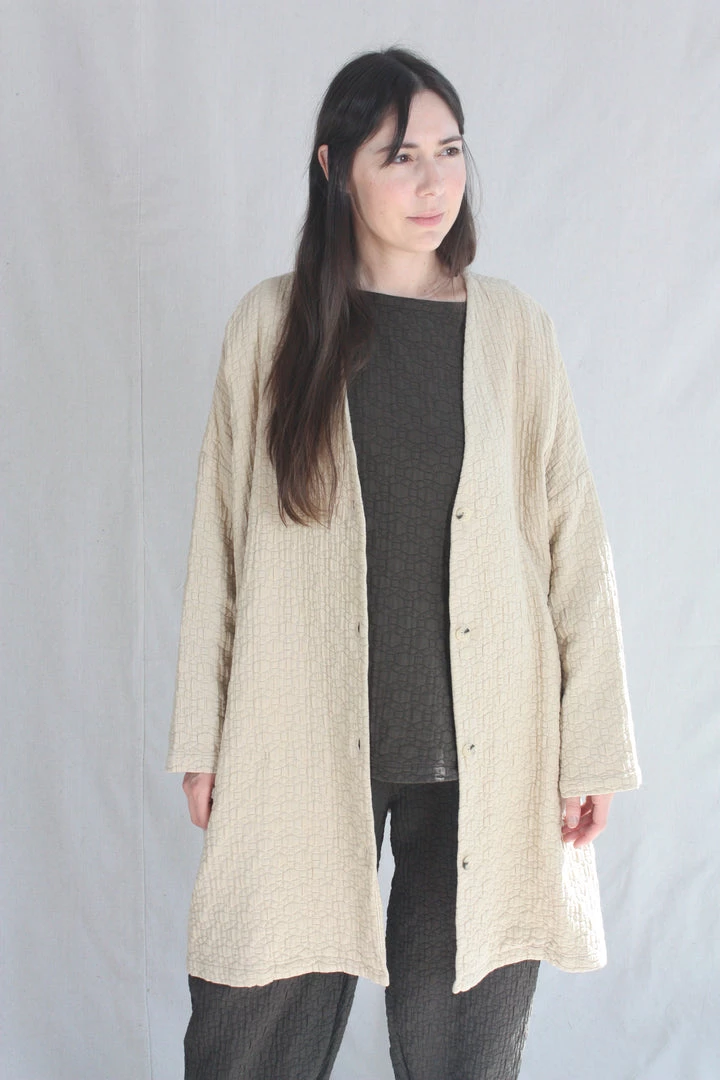 A relaxed v neck jacket with facing in a soft quilted cotton. Button closure at front with dropped shoulder and boxy shape. Side seam pockets.