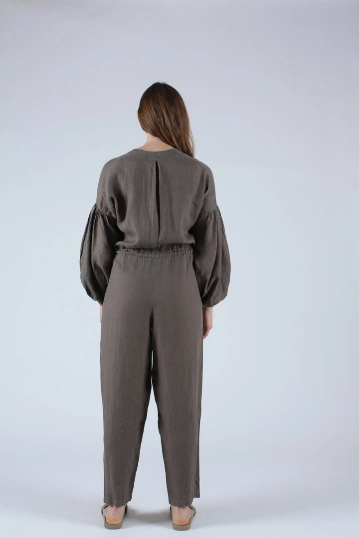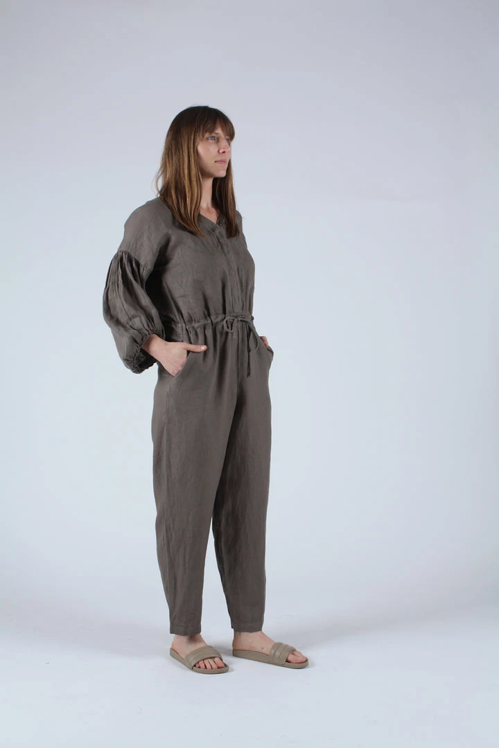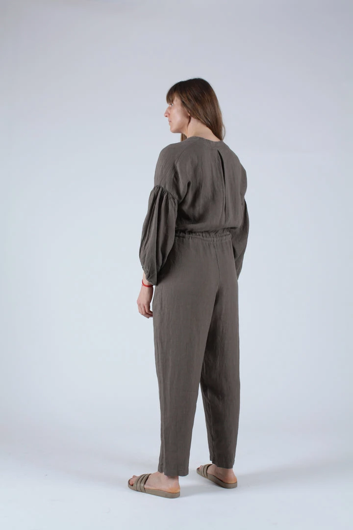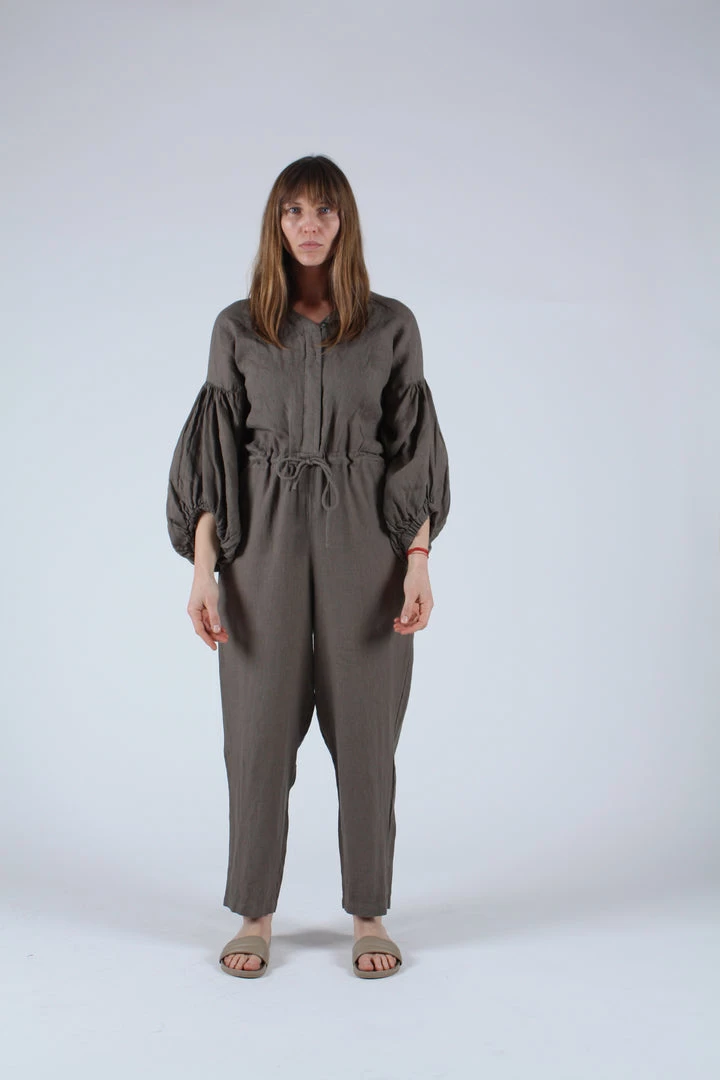 A relaxed jumpsuit with a v neck and button front with covered placket. Dropped shoulder and shirred puff sleeves with elastic cuffs. Draw string waist for adjustability. Box pleat detail at back and side pockets.