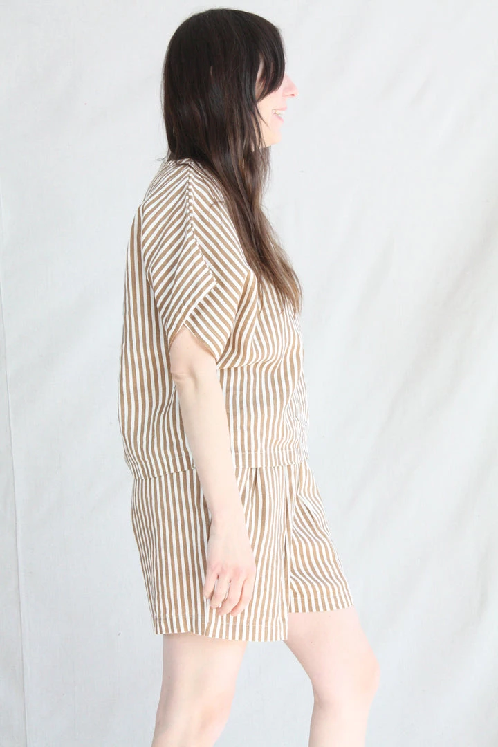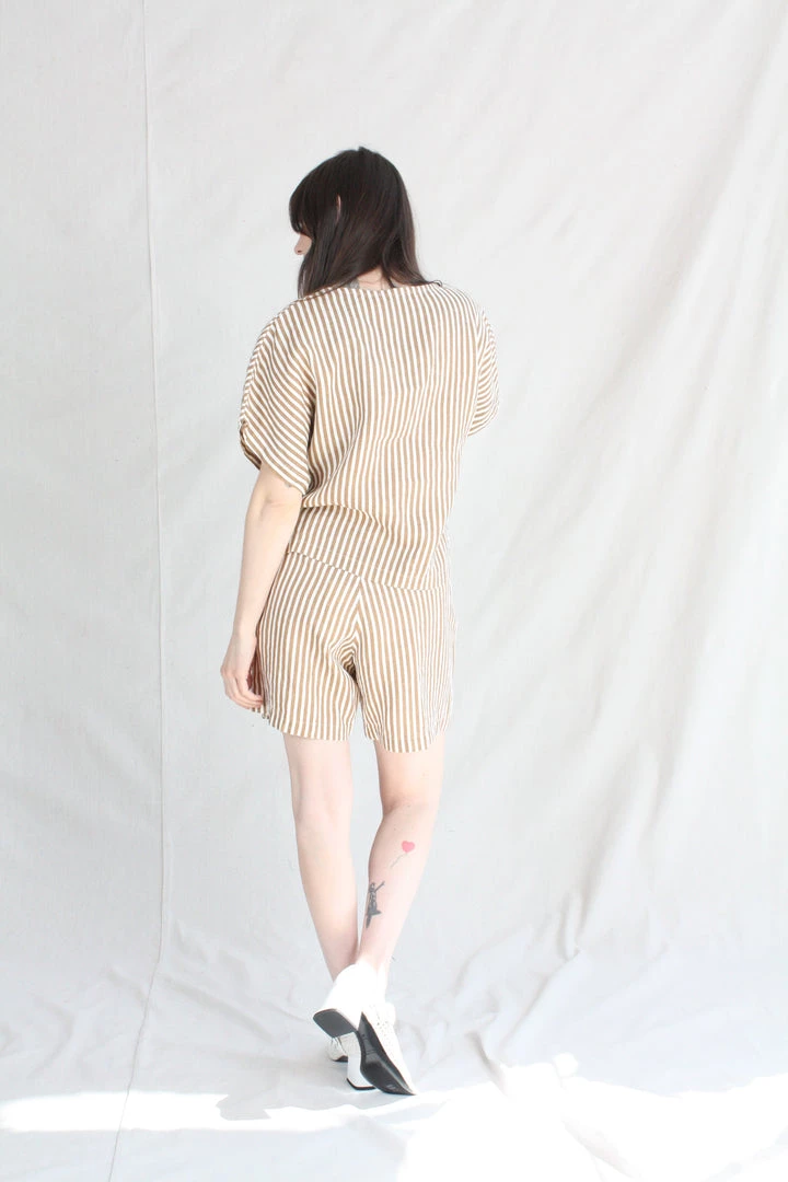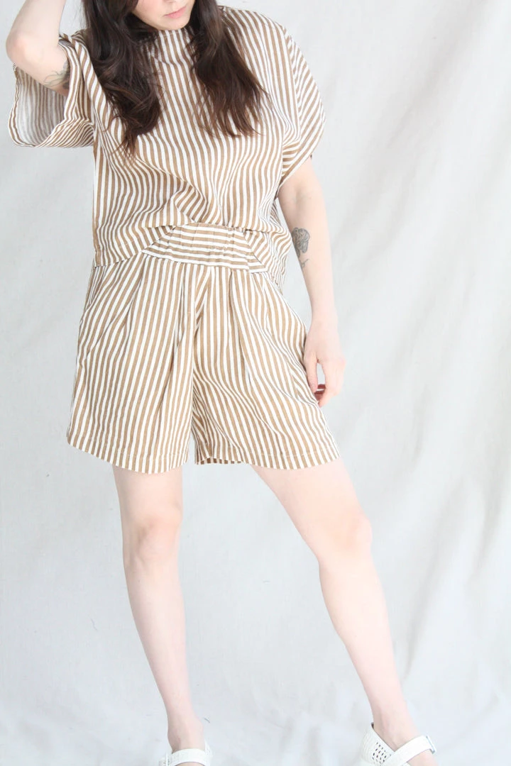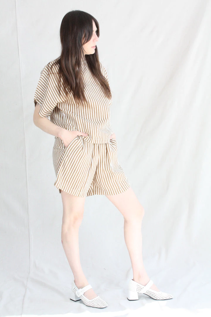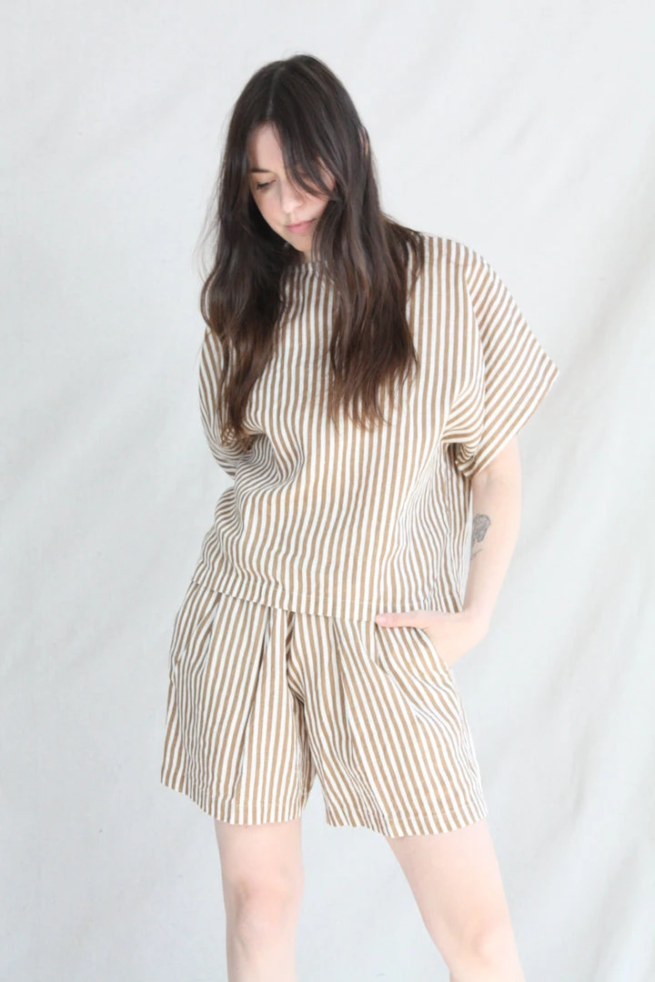 Aย relaxed short with an elastic waistband. Front creased box pleats. Side seam pockets. The printed stripe is imperfect due to the texture of the linen.