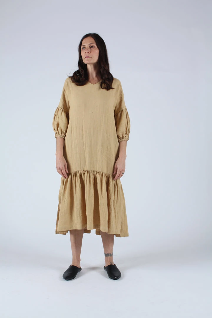A relaxed airy dress with a v-neck and dropped shoulders. Shirred puff sleeves with elastic cuffs. Â Long side slits on bottom and side seam pockets.