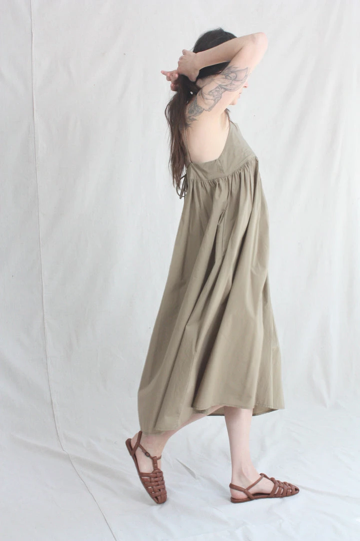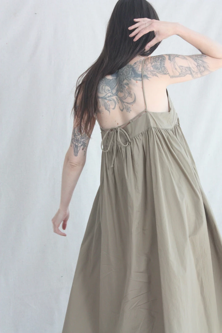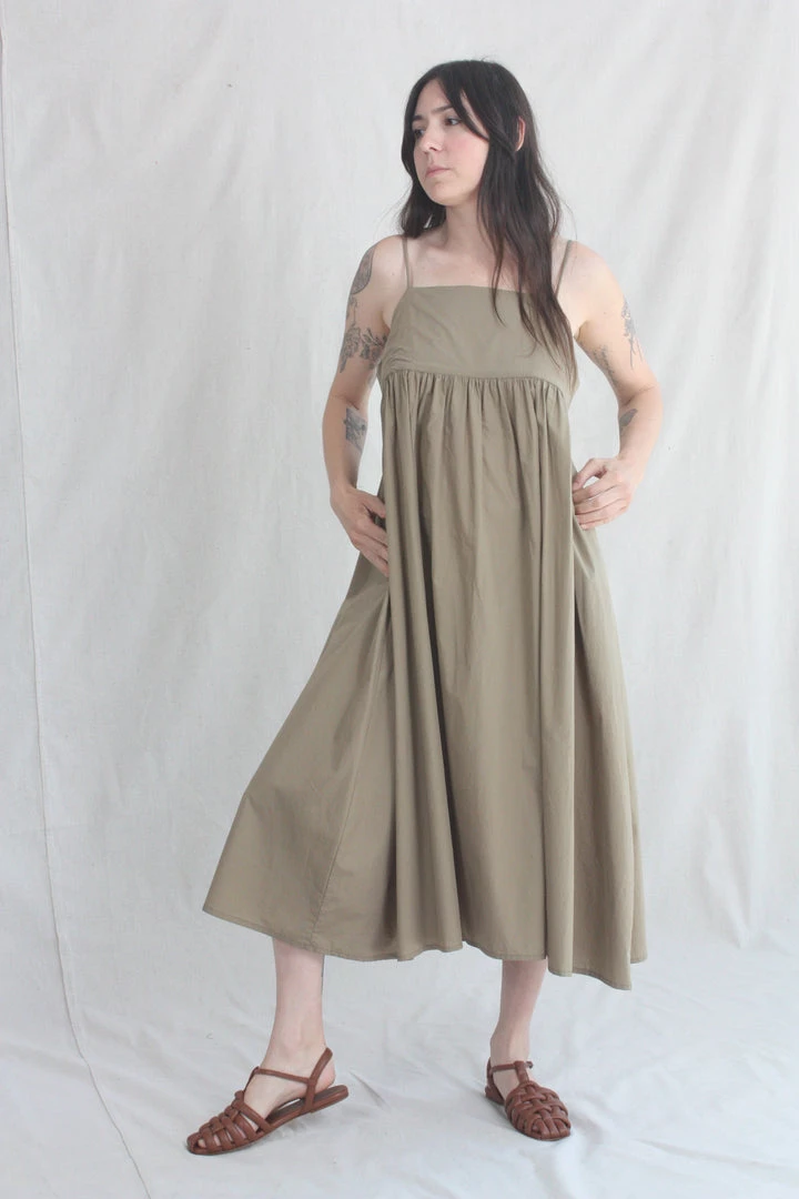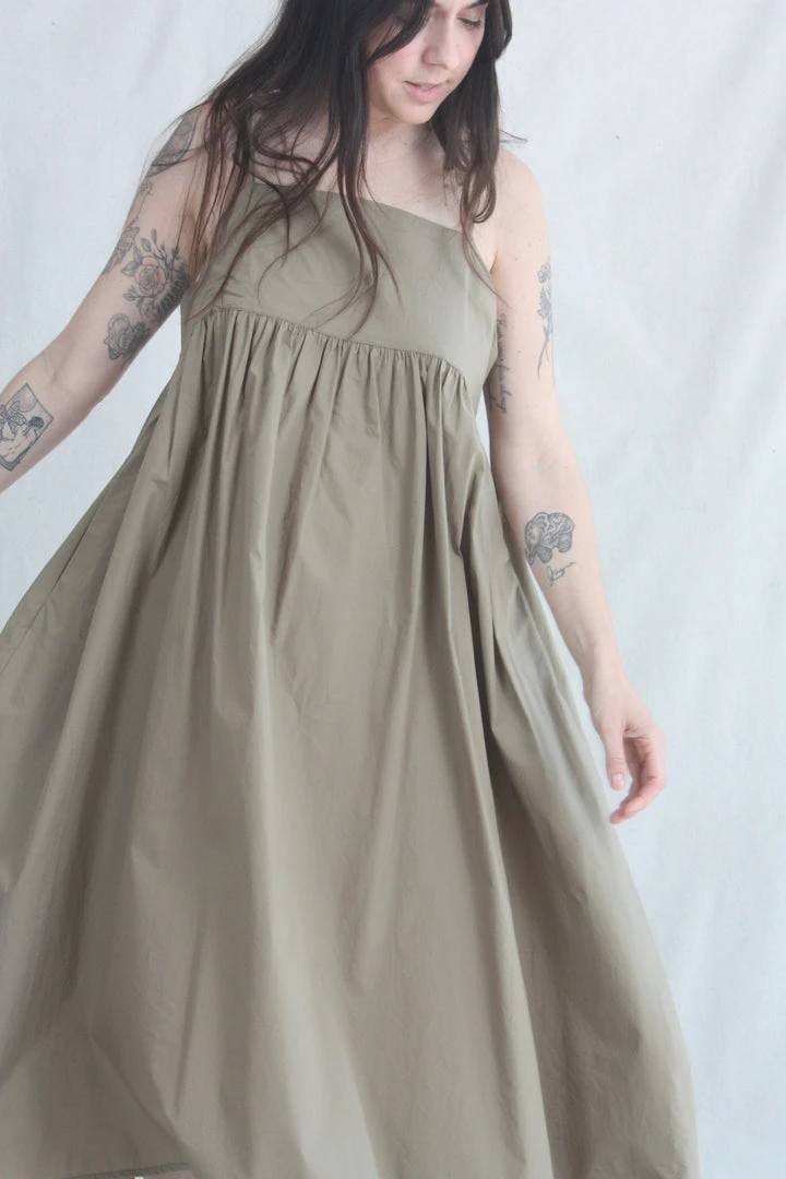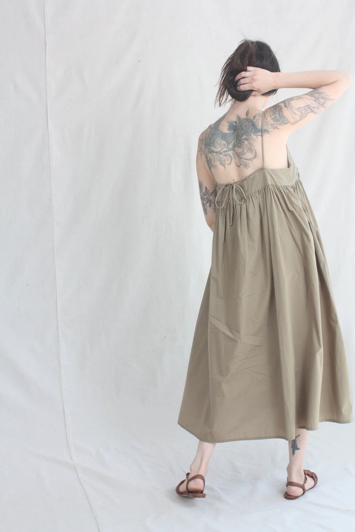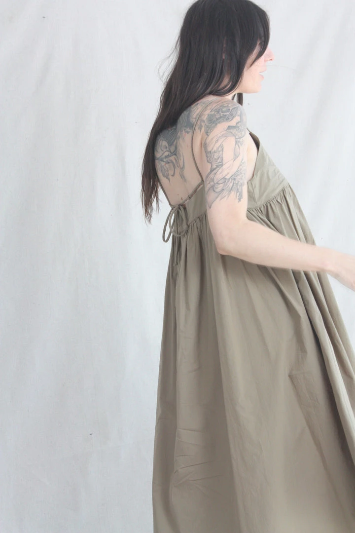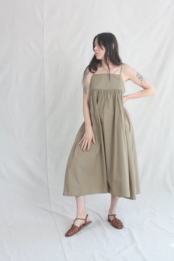 A relaxed, airy dress with shirring detail all around. Adjustable tie strap. Side seam pockets.