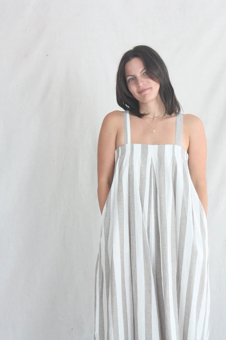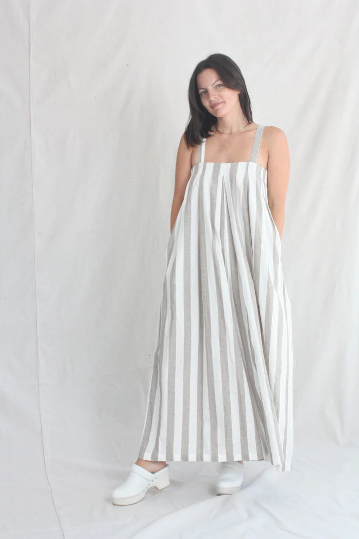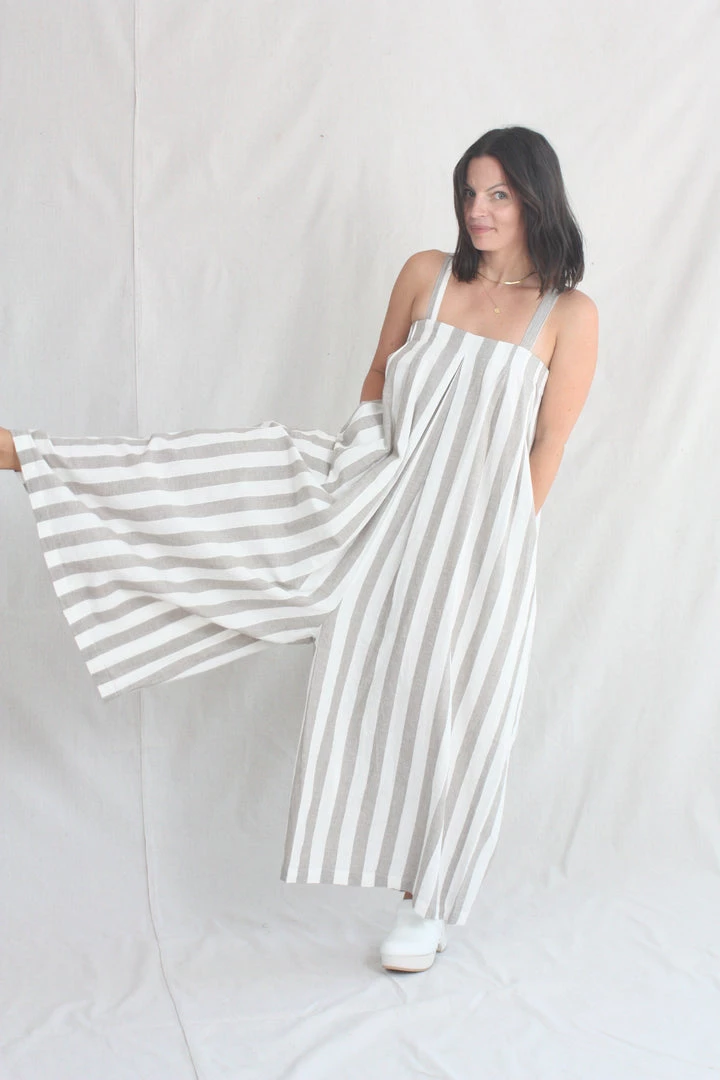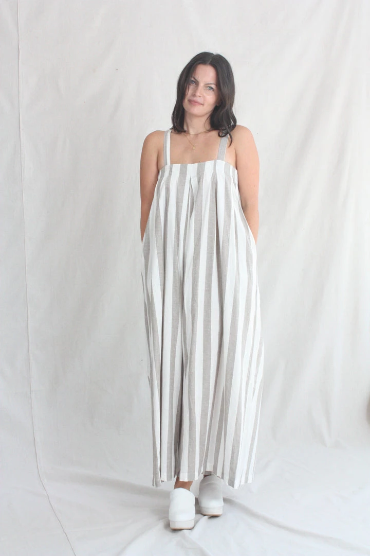 A relaxed, airy voluminous jumpsuit in a cotton, linen. Flat front neckline with a gathered elastic back. Inverted pleats at front and back center. Dropped crotch with wide legs. Side slit pockets.