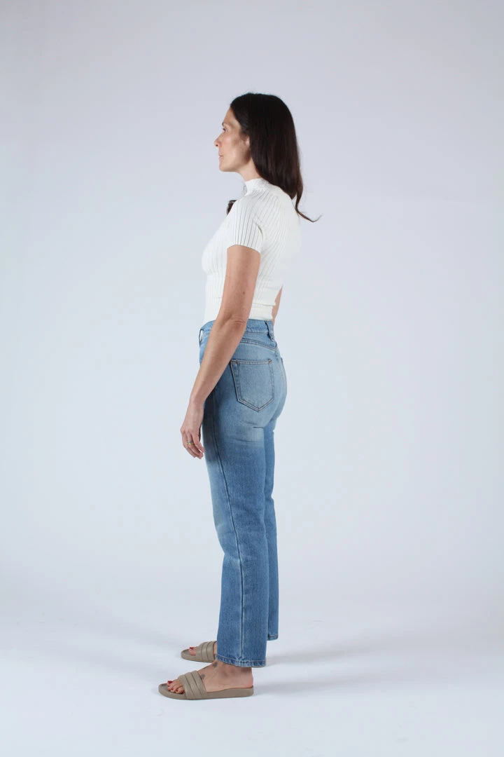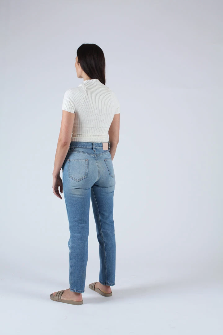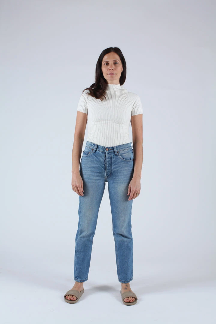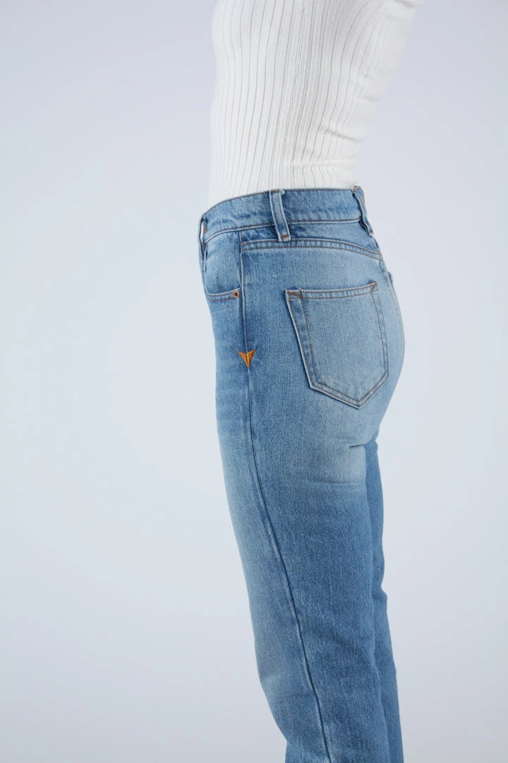 A timeless button fly silhouette with a rise that sits at high hip, eases into a straight leg, and hits at the ankle. Medium wash deadstock cotton indigo denim. Each pair features custom BAM hardware, pocket bags made from deadstock stripe shirtings, and our signature embroidered Western arrow bar tack.