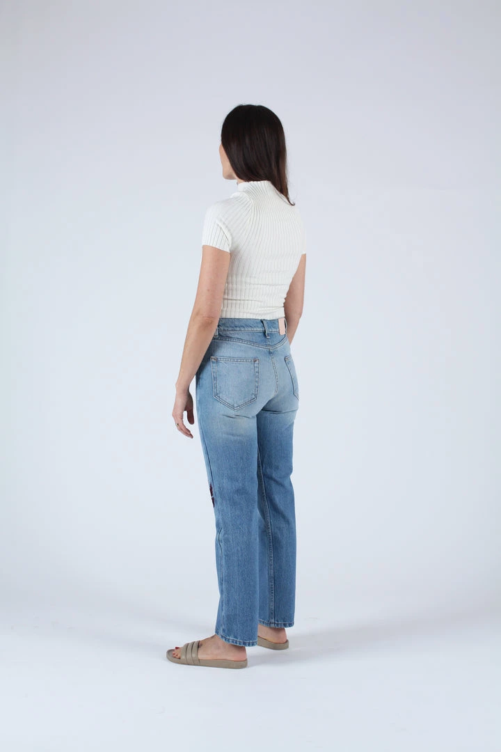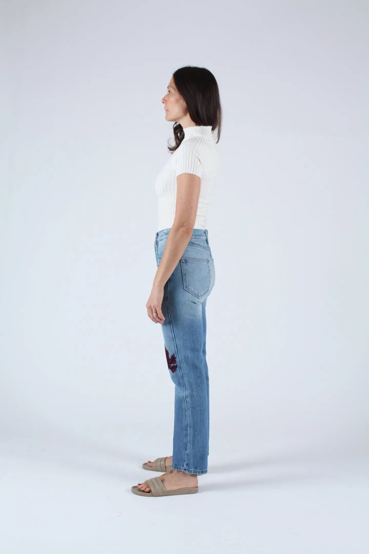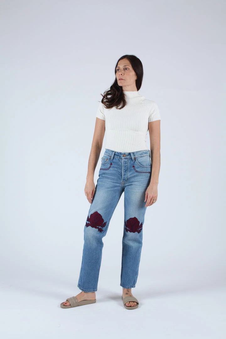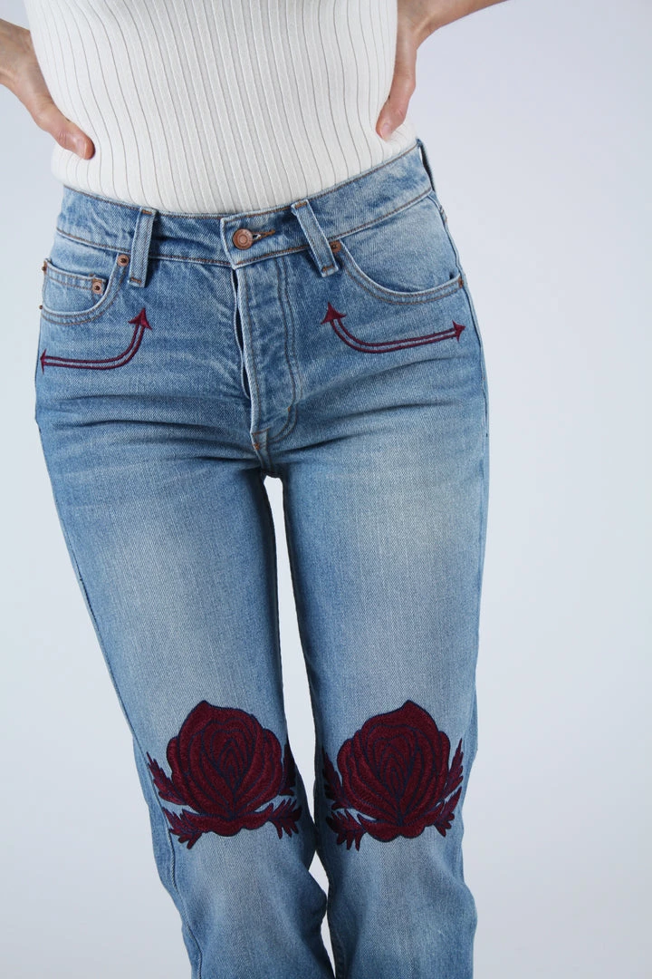 A timeless button fly silhouette with a rise that sits at high hip, eases into a straight leg, and hits at the ankle. Featuring chain stitch embroidered roses and smile pocket details in a deep red over a medium wash deadstock cotton indigo denim.