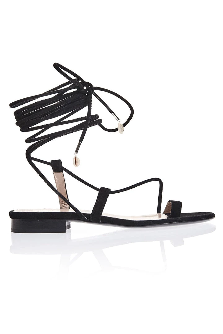 An easy ankle wrap sandal. Seashells dangle from ankle straps. Both feet have different tie closures.