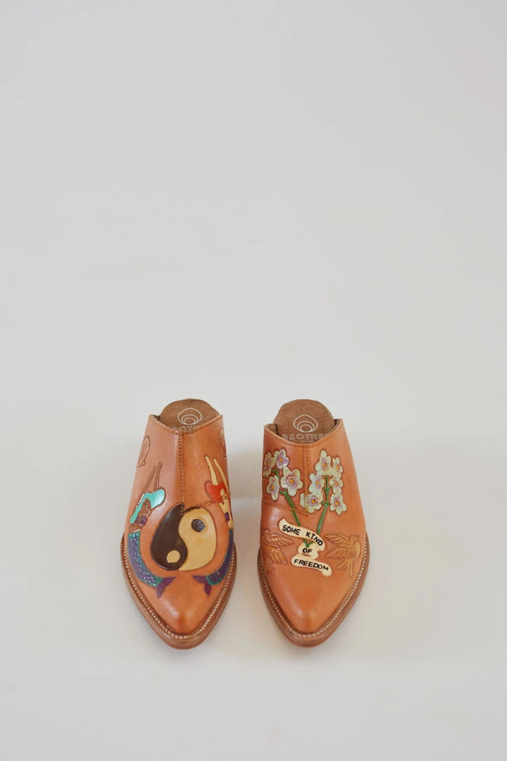 Cowboy style mules hand painted with symbols, made in very small batches.
