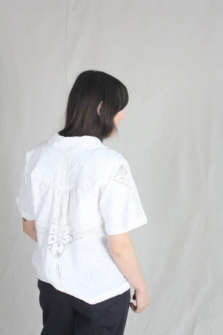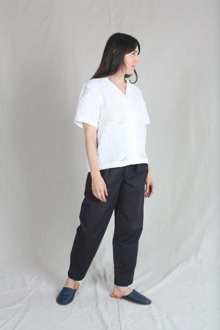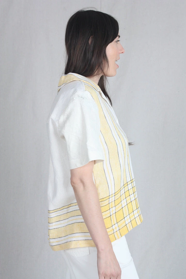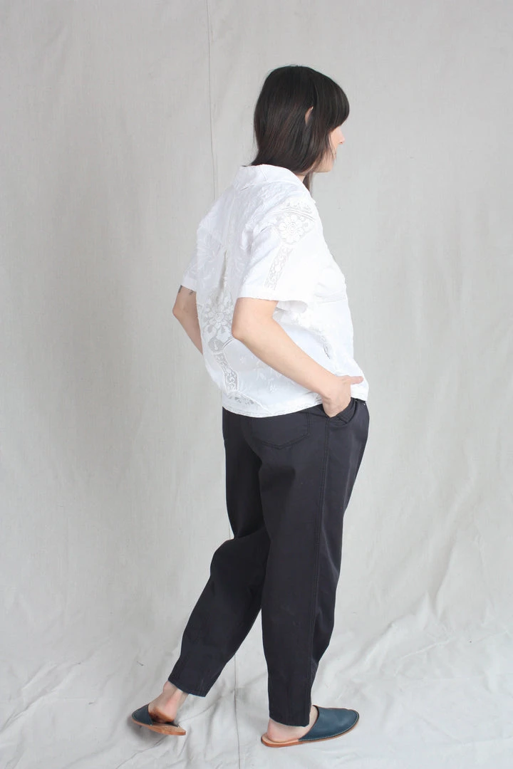 The Dinner Party Shirt is one of a kind, made from a vintage tablecloth sourced at flea markets and estate sales around southern California. The back features pointed collar and yoke details.ย This shirt features one of a kind textiles that are hand picked by Carleen. They may include wear, distress, marks, and other signs of delicious meals shared between friends intentionally as we believe this adds to the character of the finished garment.