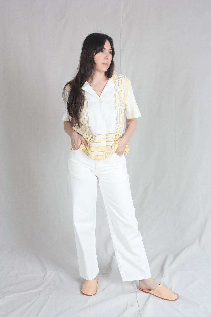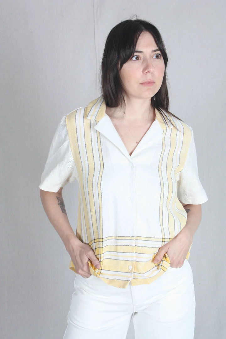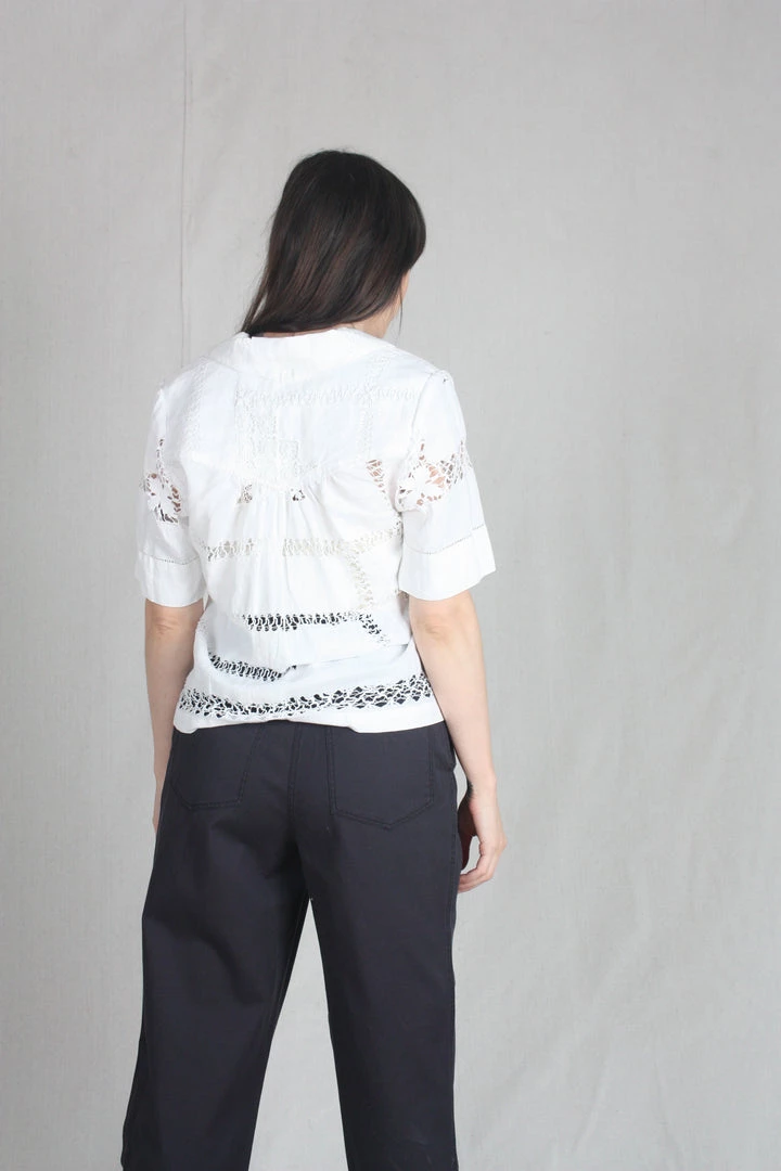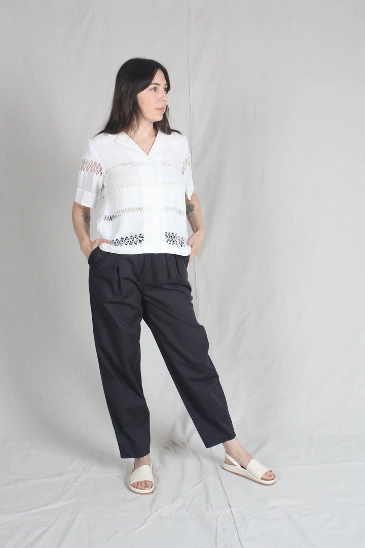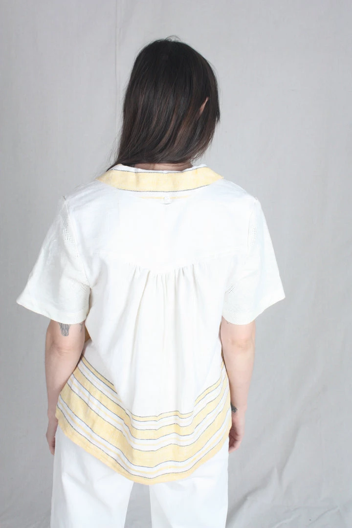The Dinner Party Shirt is one of a kind, made from a vintage tablecloth sourced at flea markets and estate sales around southern California. The back features pointed collar and yoke details.ย This shirt features one of a kind textiles that are hand picked by Carleen. They may include wear, distress, marks, and other signs of delicious meals shared between friends intentionally as we believe this adds to the character of the finished garment.