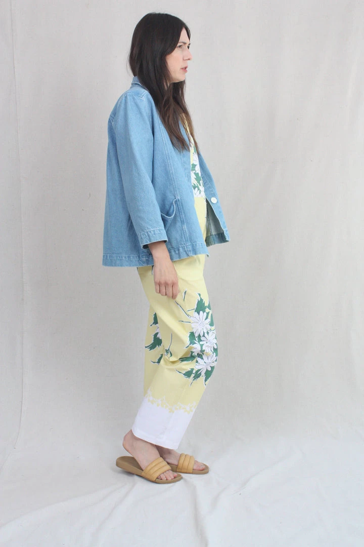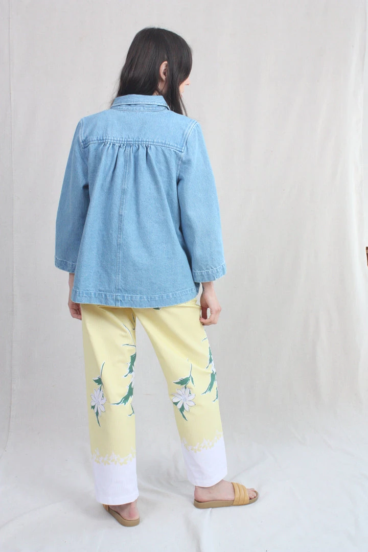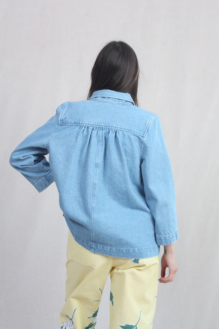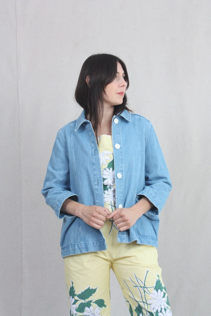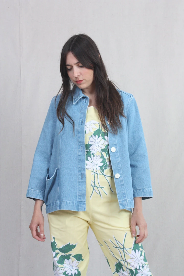 A denim jacket with bracelet-length sleeves, an a-line shape, and voluminous pockets. A perfect layering piece, in a soft washed denim that goes with everything!