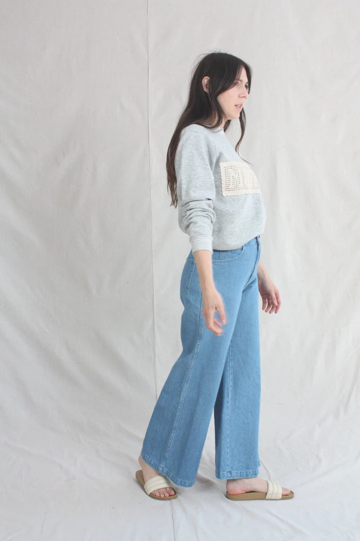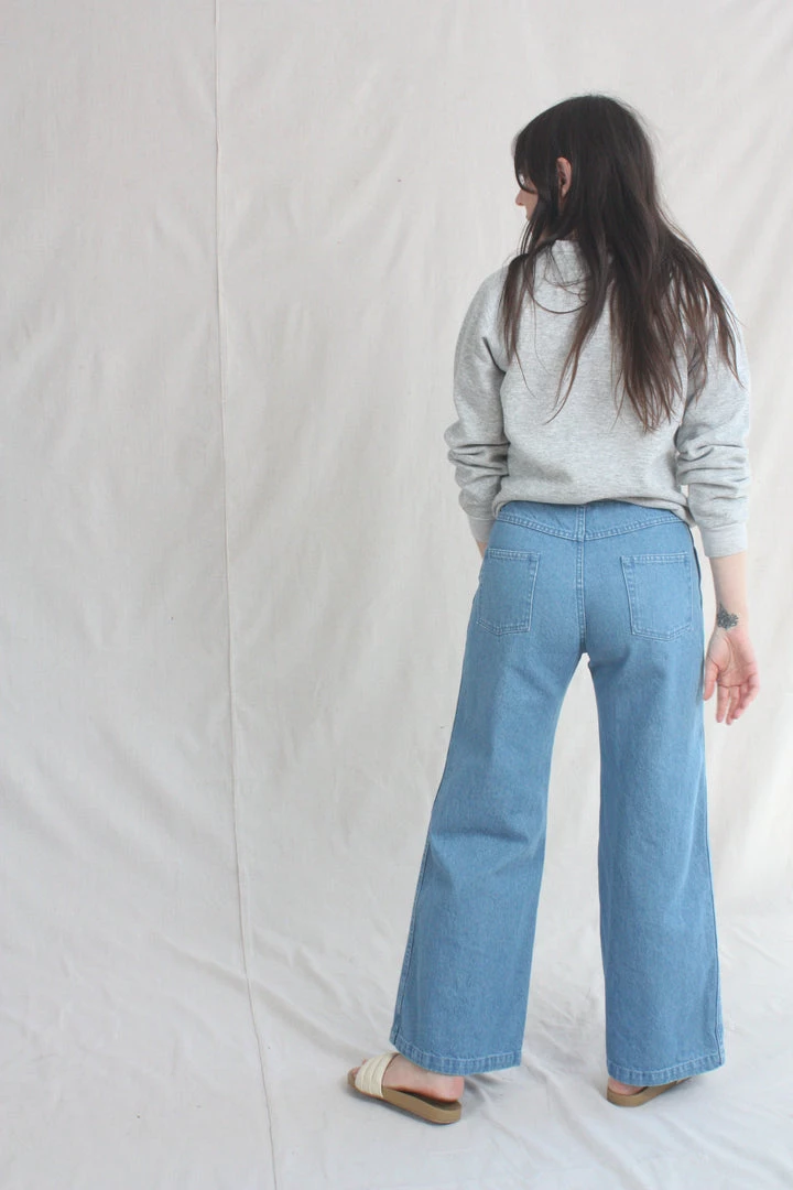 The Nelly has a high-rise fit through the torso, with a wide-leg silhouette from the thigh down. 100% cotton denim holds you in, but eases up in all the right places with repeated wear. Rinsed dark blue on the right leg and a light blue from the reverse side of the denim on the left. 12” rise. Each pair is given a quick wash to shake out some of the initial stiffness of raw denim.