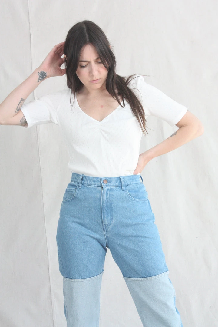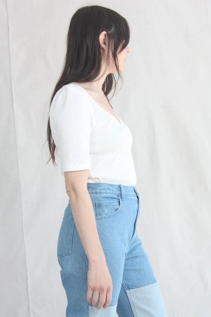 The Lara Tee is constructed from deadstock pointelle and features short sleeves and a sweetheart neckline.