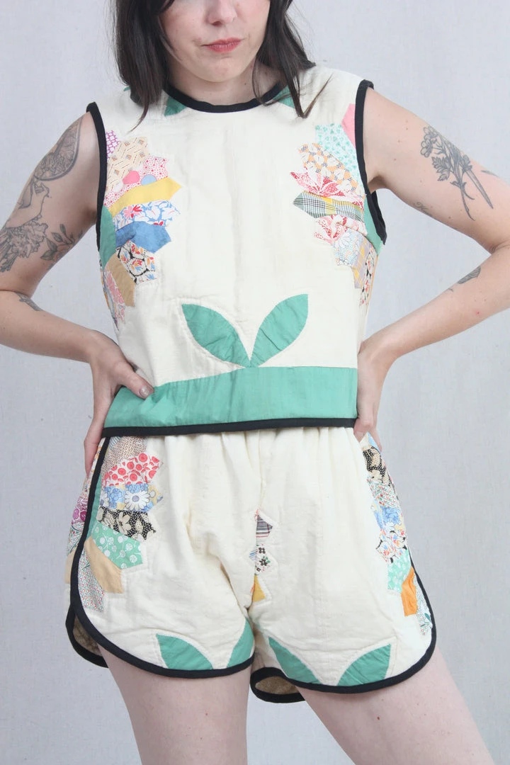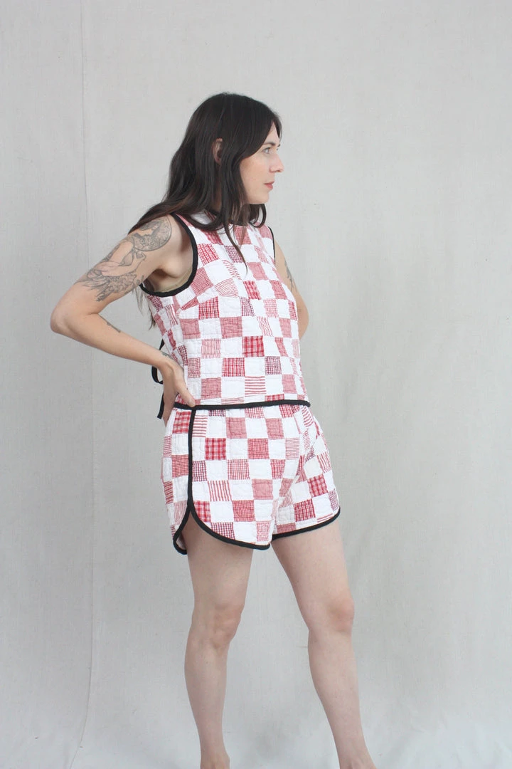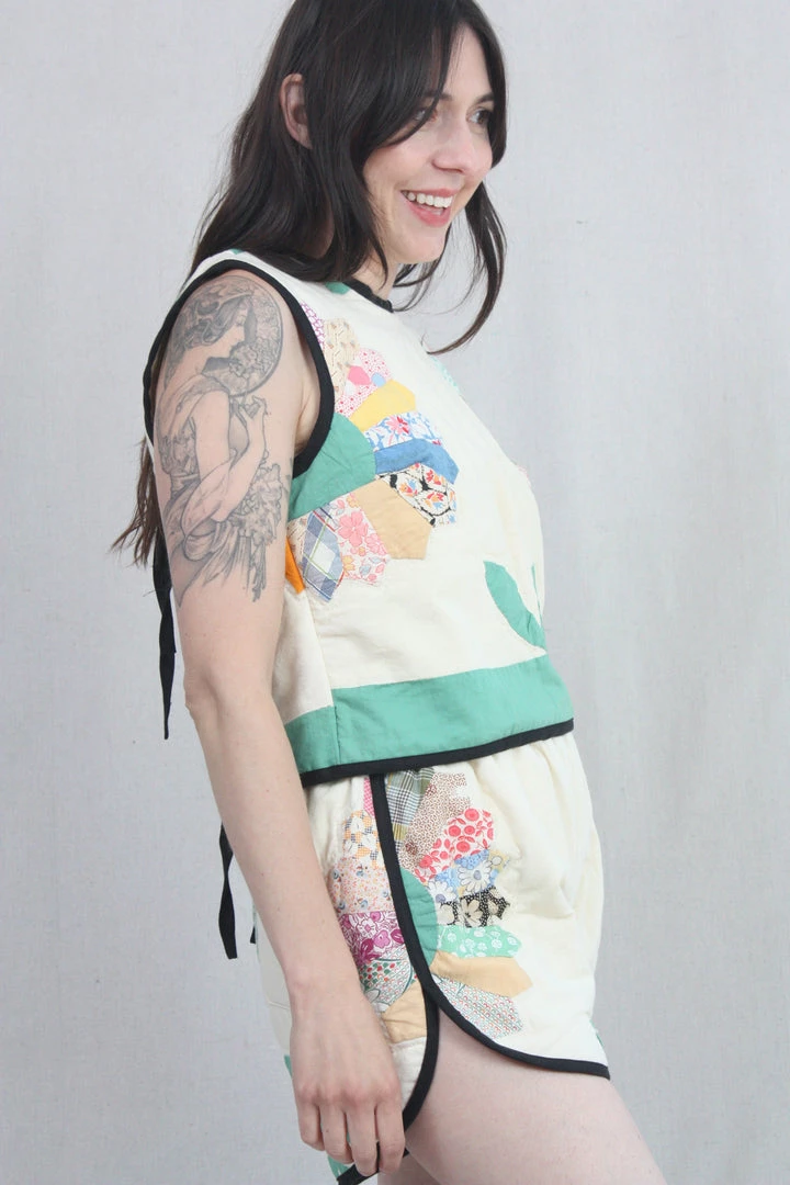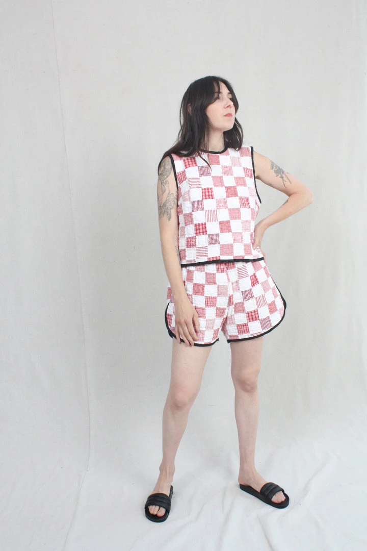 The cutest quilt shorts that ever lived, with black linen bound edges, a single back pocket, and elastic waist. Wear with matching Quilt Shell or a simple tee. These shorts feature one of a kind textiles that are hand picked. They may include wear, distress, marks, and other signs of age that add to the character of the finished garment.