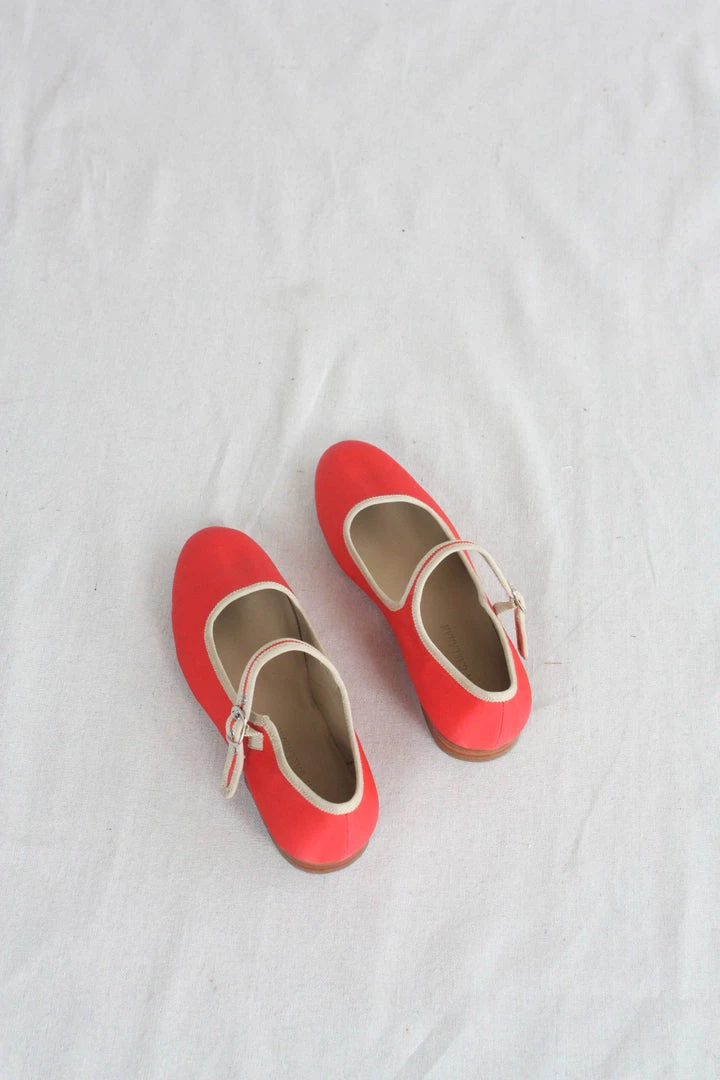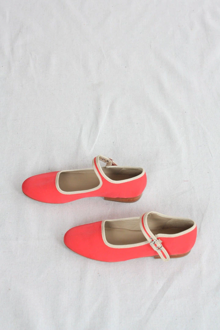 A classic Mary Jane in coral nylon and sand trim with adjustable brass buckle closure and contrast binding. Leather sole with 3/4″ block heel. Natural leather insoles.Â
