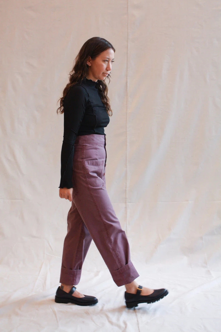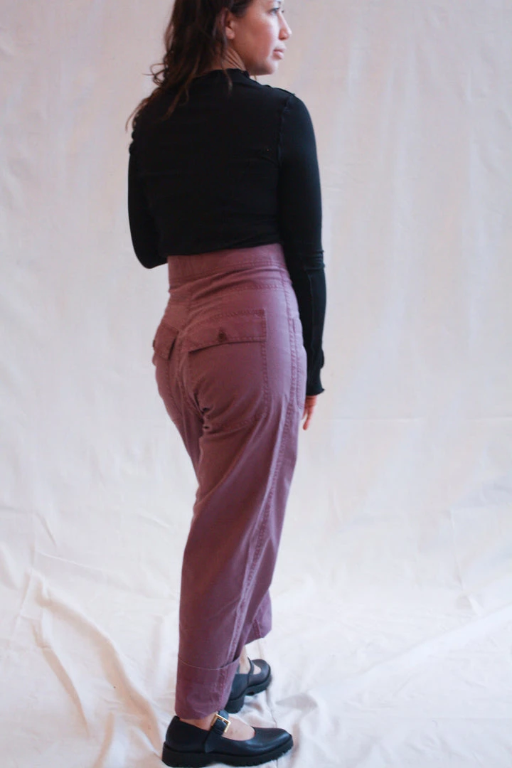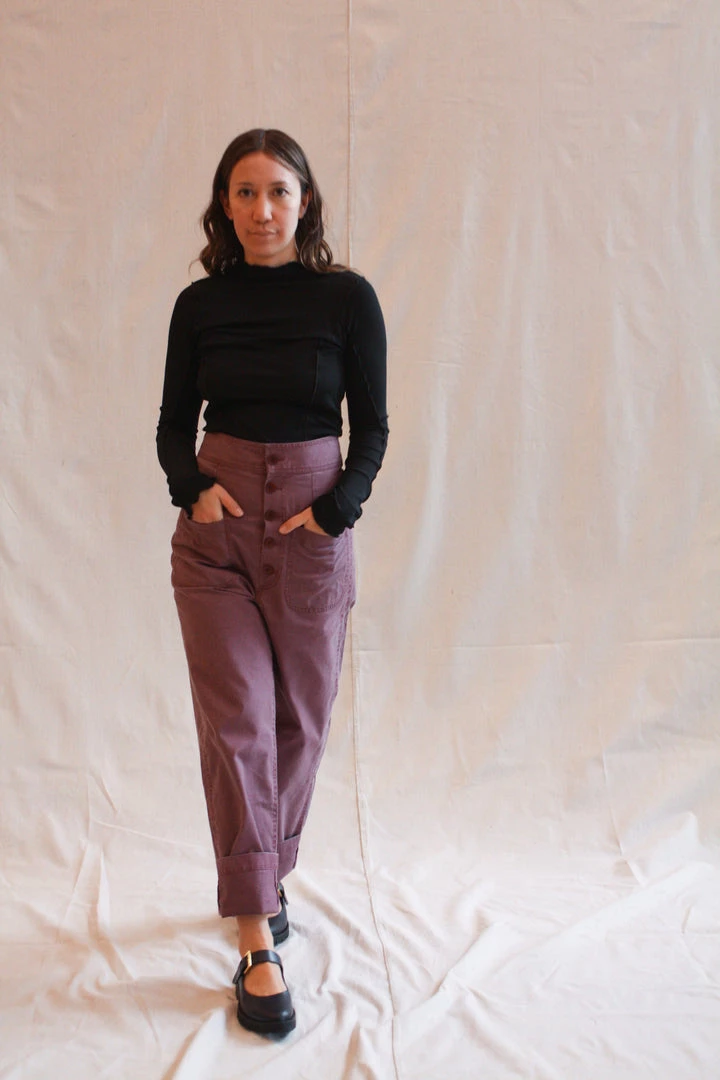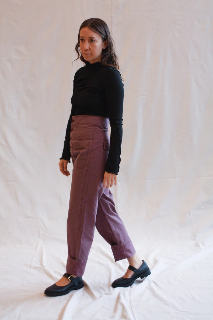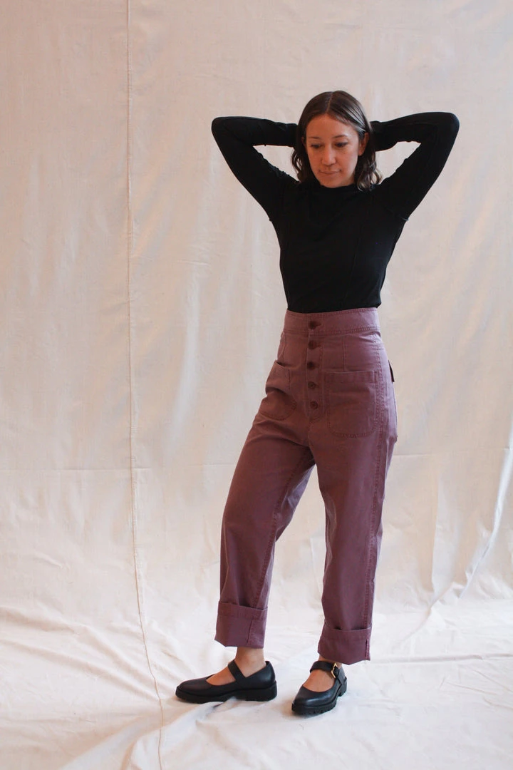 The Emily Pant is a high-waisted pant with military details, a high rise, straight leg, and a relaxed fit. Features front patch pockets, exposed button fly, and flap back pockets. The Emily Pant is made for everyday wear and ease.