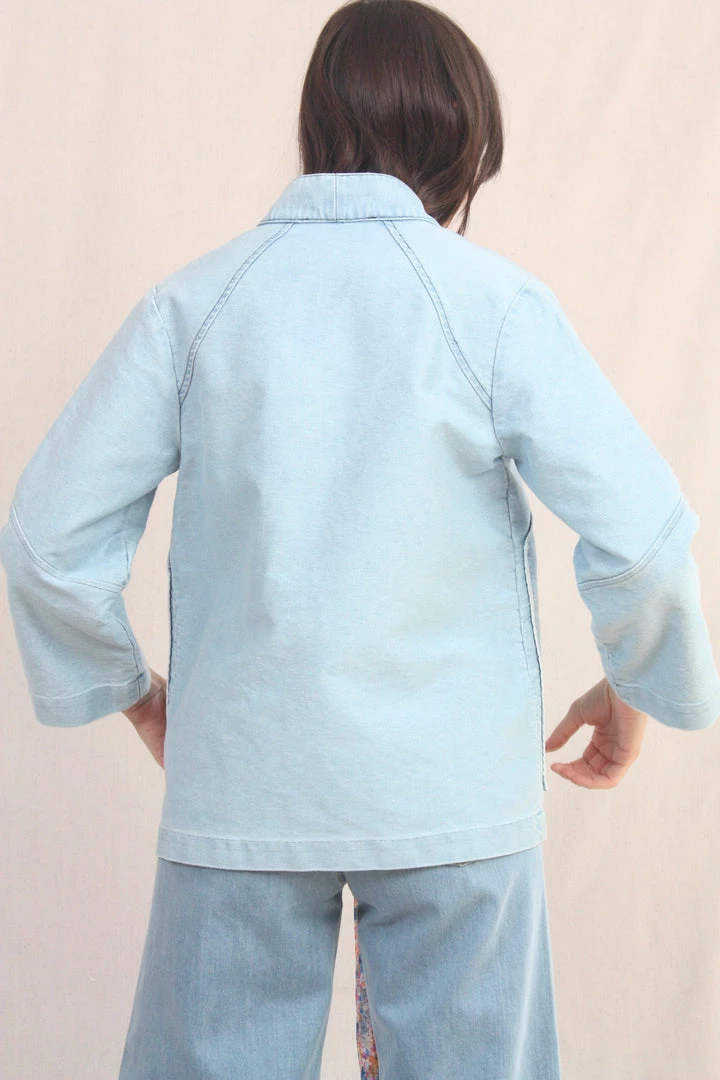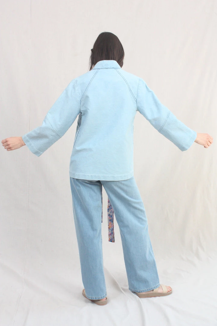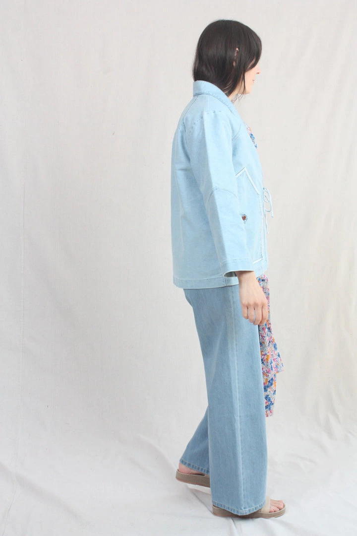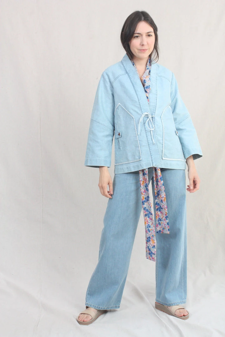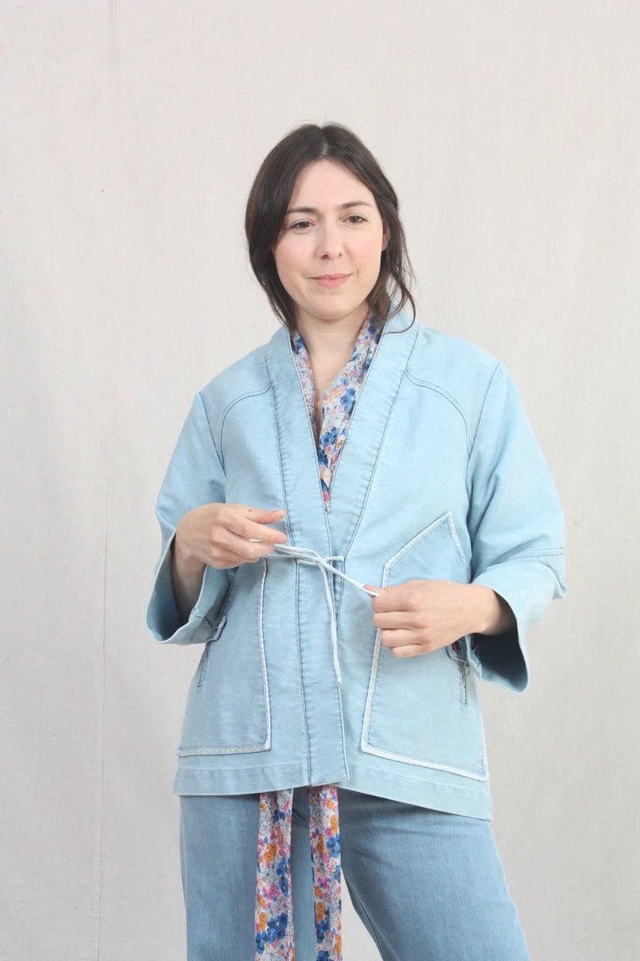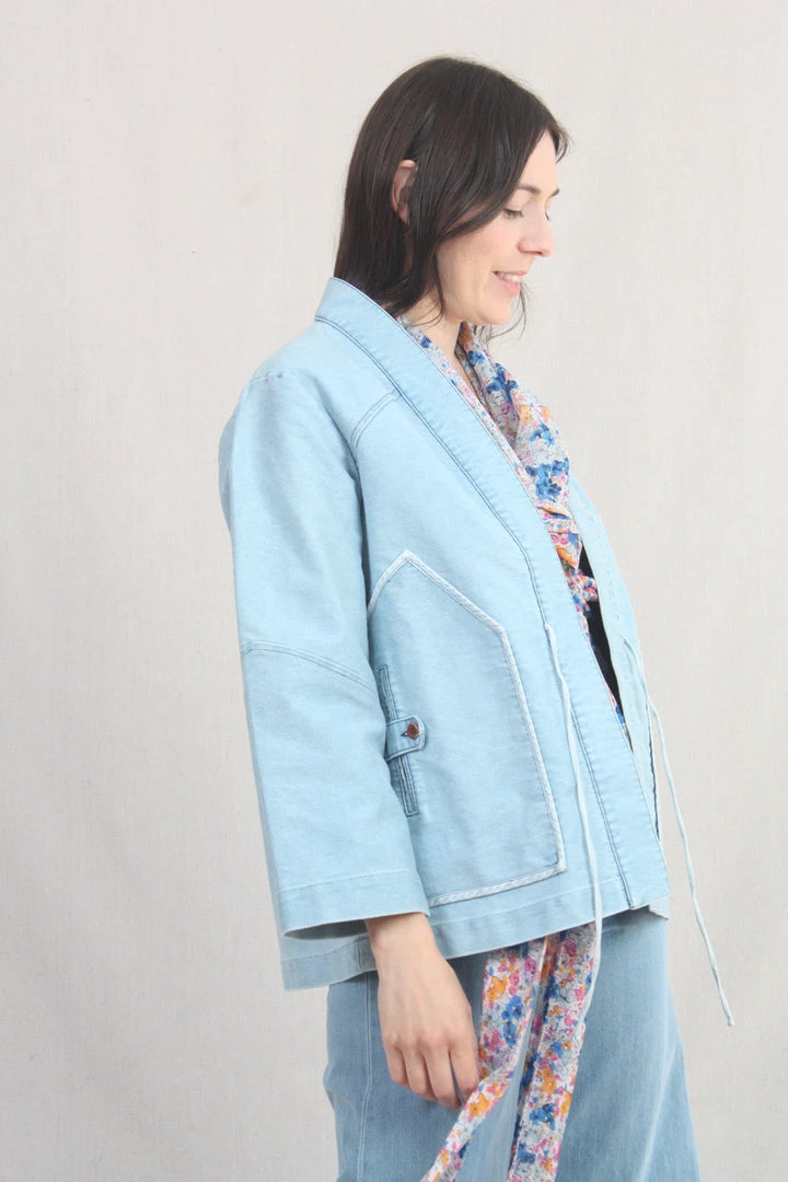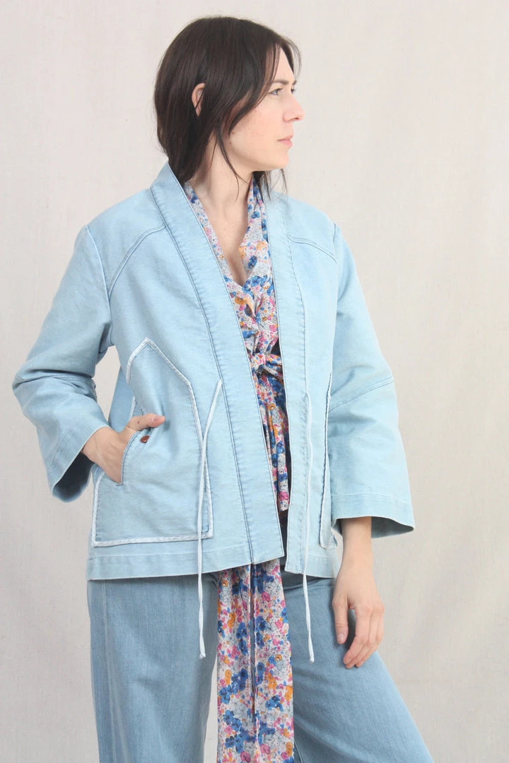 The Orla Jacket is a Kimono inspired jacket with side patch pockets and a spaghetti tie front closure. Lightweight and easy to wear.