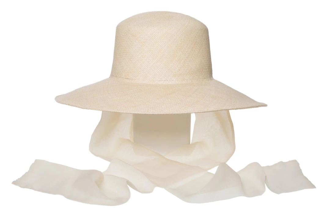 An Elegant flat top shape with wide sloping brim. Panama straw with detachable soft Japanese chiffon ties.