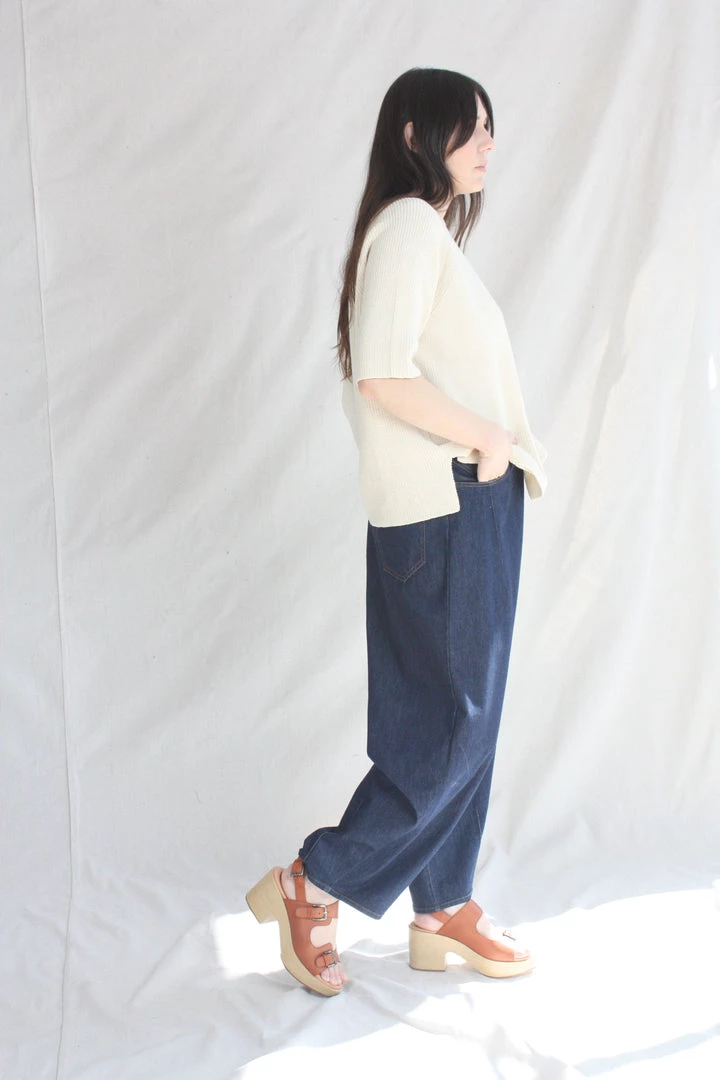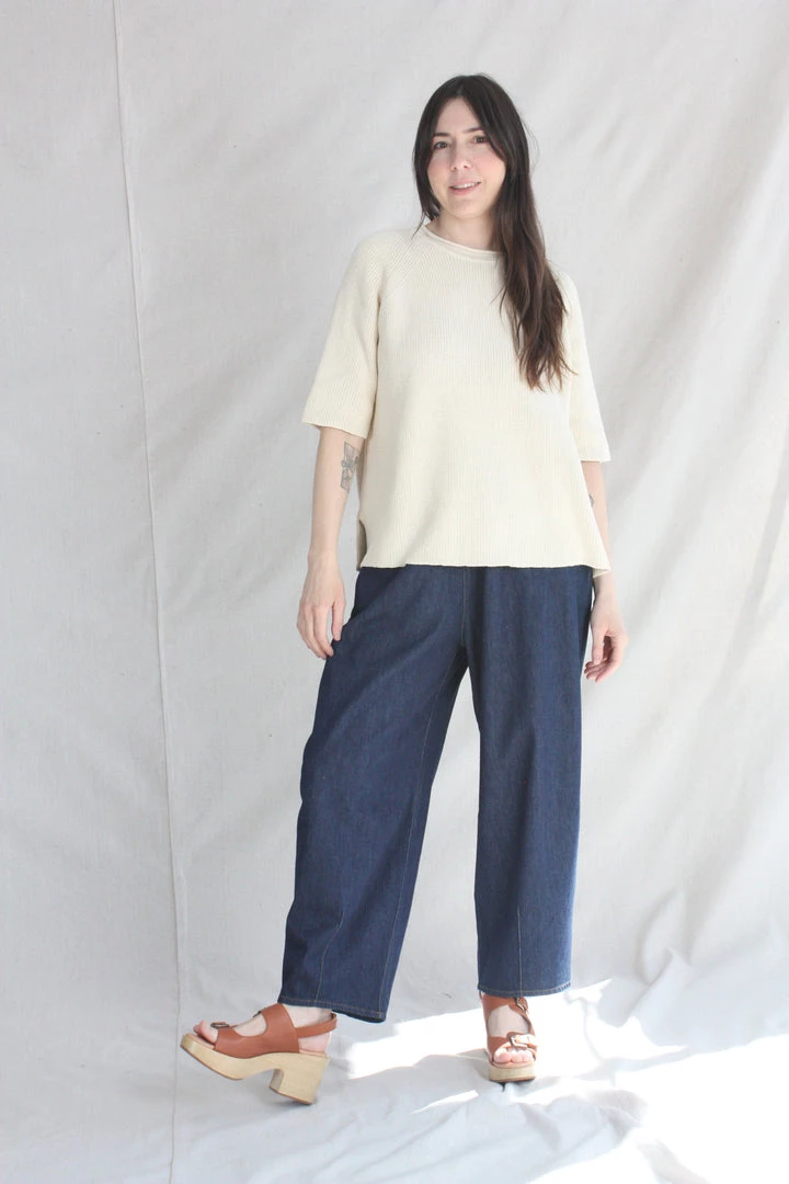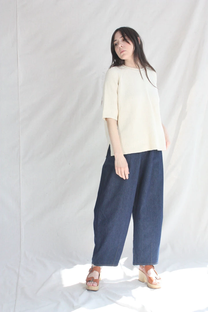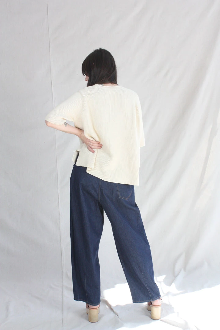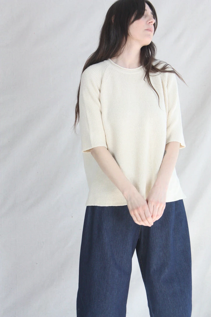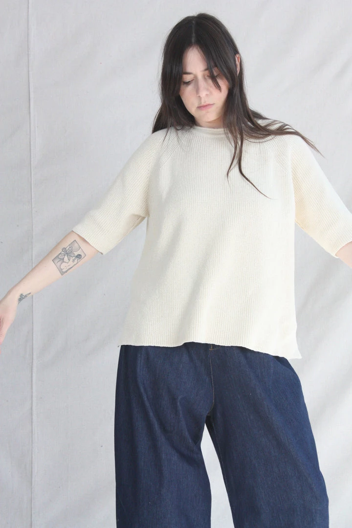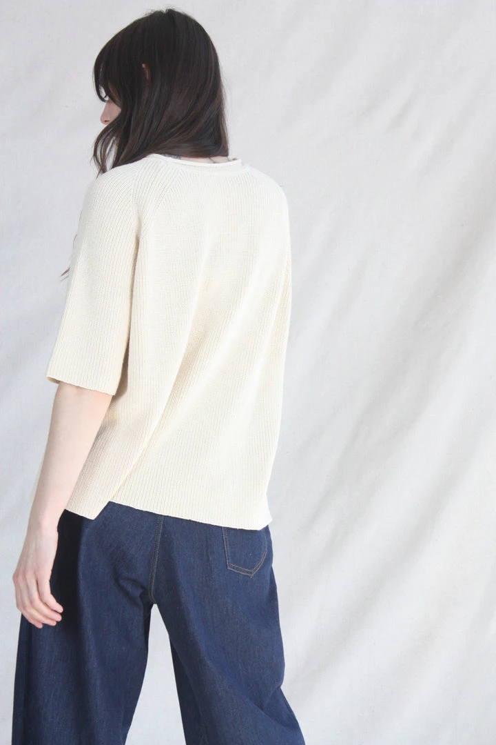 A comfy essential. Designed for a loose fit, easy to wear year round. Ribbed finish and round neck, short sleeves and side openings. Light structure, soft texture. This sweater is ethically and carefully manufactured in La Coruña, from high quality yarn, with Japanese machines and finished by hand. Cordera uses yarns with certified traceability and production cycle that strives to lower their environmental impact.