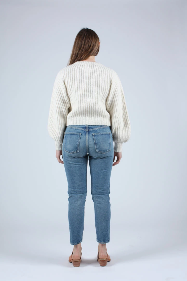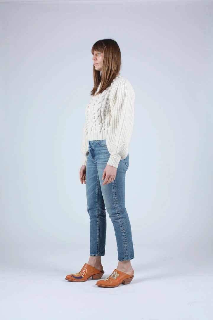 A relaxed and textural sweater with easy body and blouson sleeves. Chunky horse- shoe cable and pop corn stitch front body and fisherman rib stitch on the back body and sleeves. Rib trims at neck, cuffs and bottom hem to control volume.