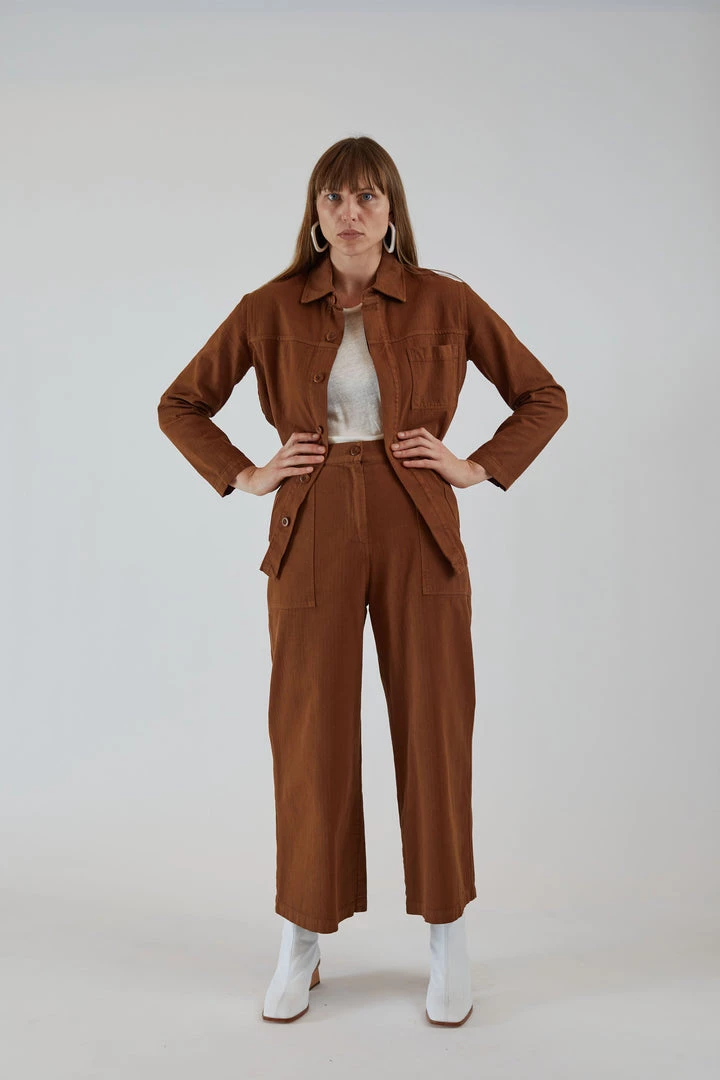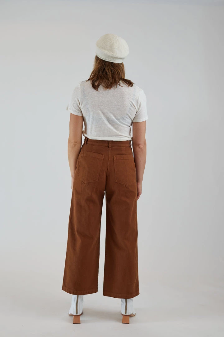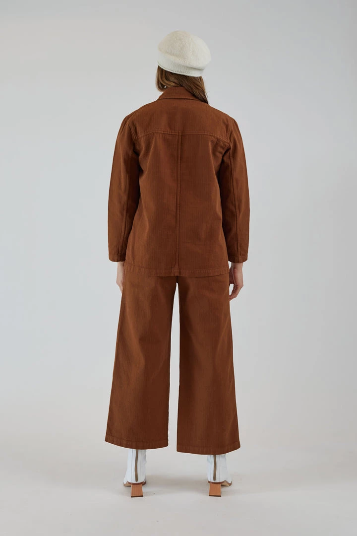 This cargo trouser is cut from a structured and soft mid weight twill that has a classic workwear herringbone stripe texture. The pant has a flattering high rise waist that is fitted through the hips and opens up to a crop wide leg. Styled with front and back utility pockets, classic topstitching, and closes with a corozo button at center front.