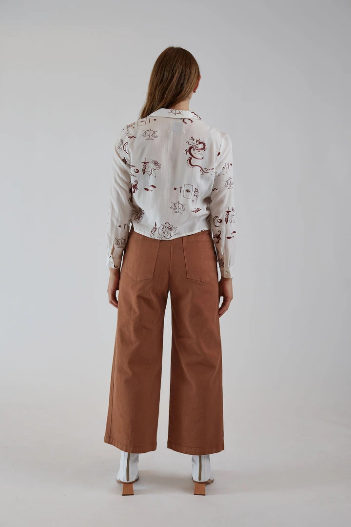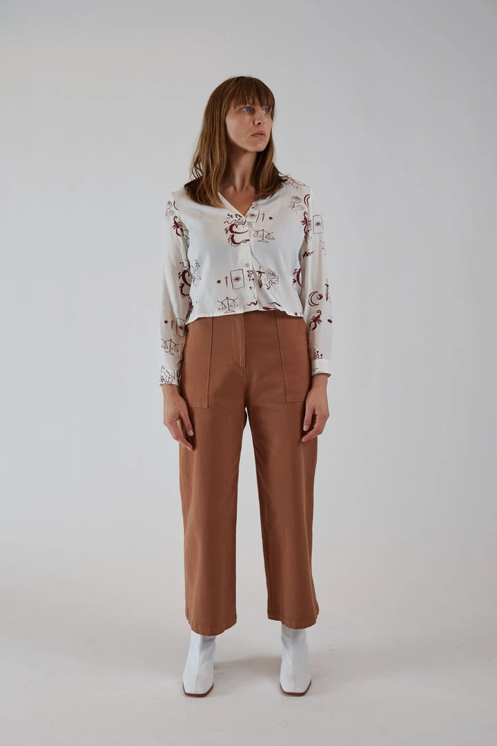 The Cargo Trouser is cut from a structured and soft heavy twill, has a high rise waist that is fitted through the hips and opens up to a crop wide leg. Styled with front and back utility pockets.