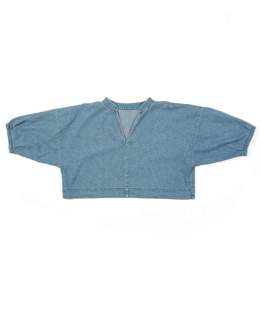 Cropped fit with V-neck. 3/4, pleated sleeves.