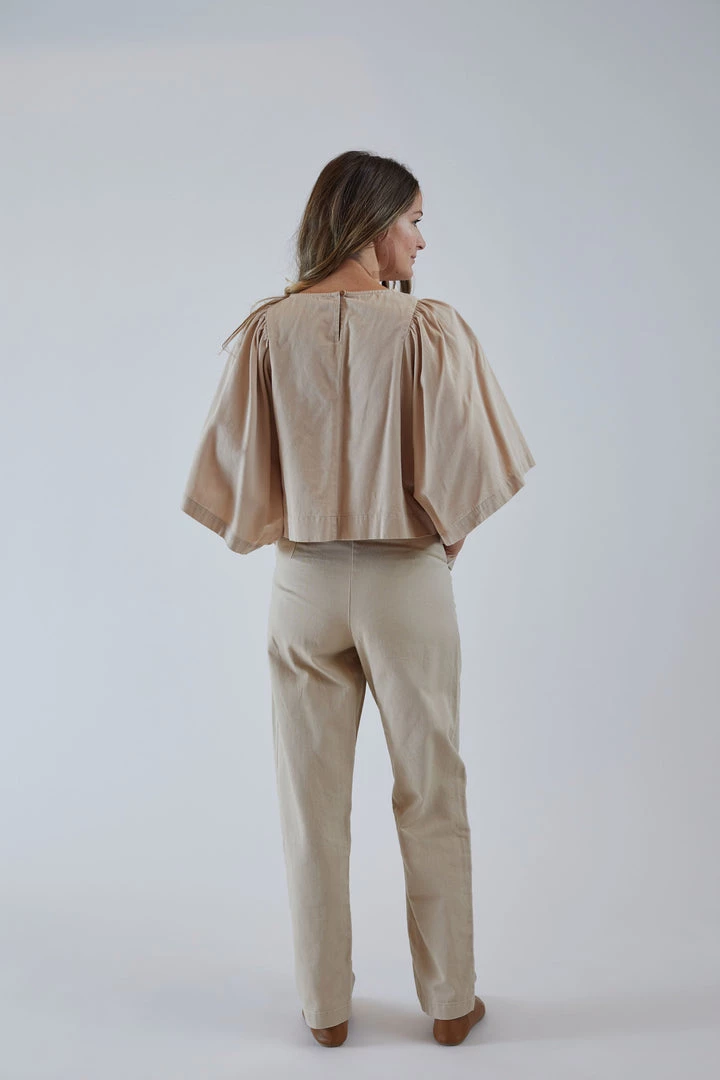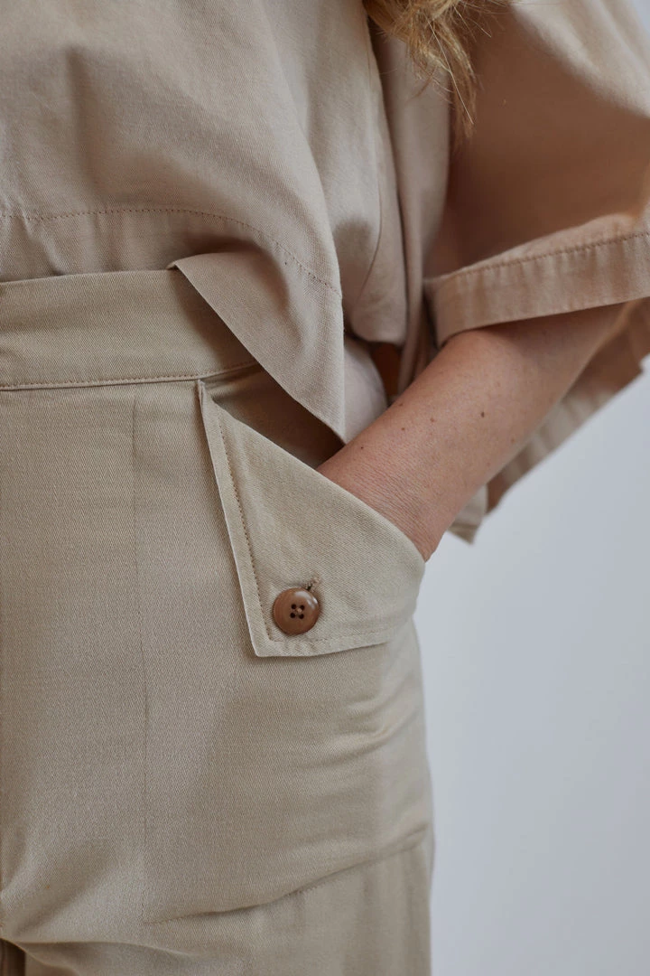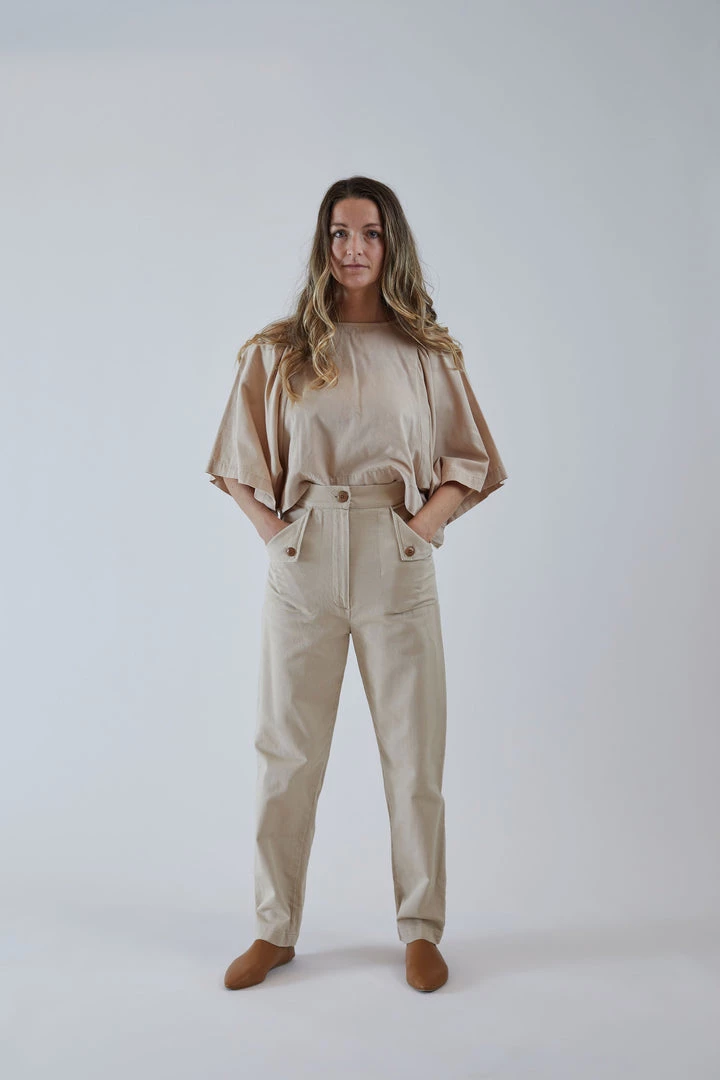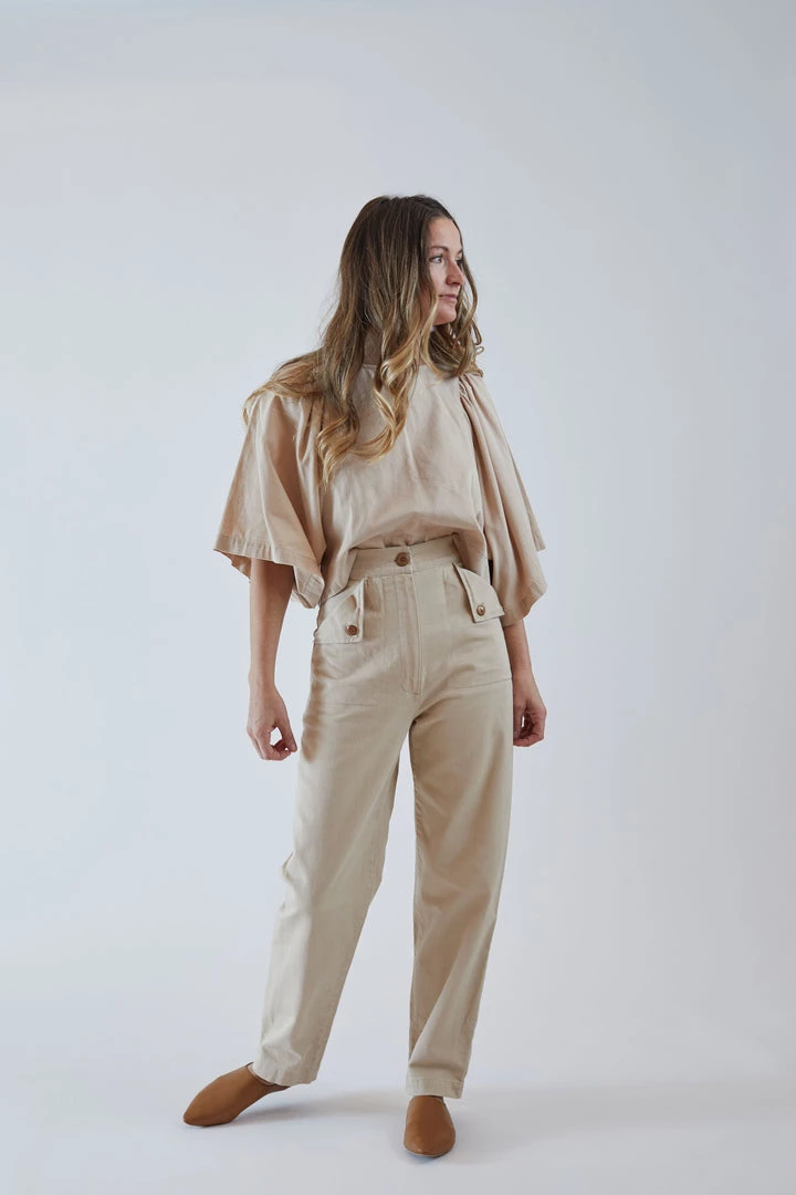 High waisted pant with a slightly tapered leg. Fold over pockets.