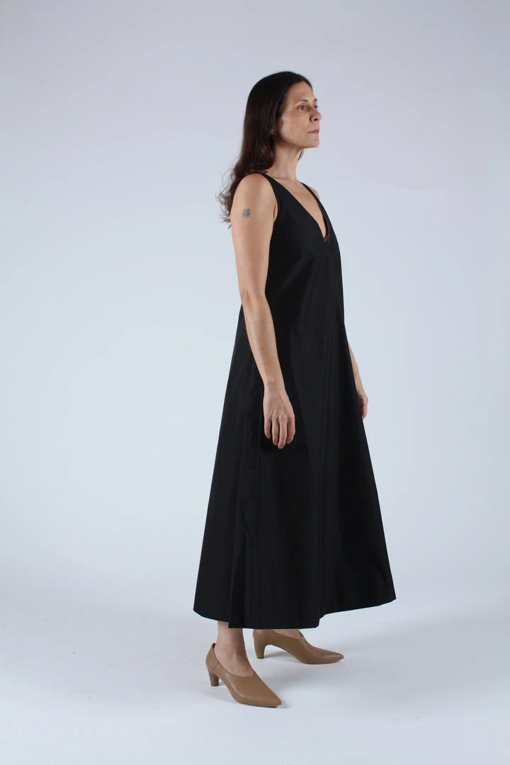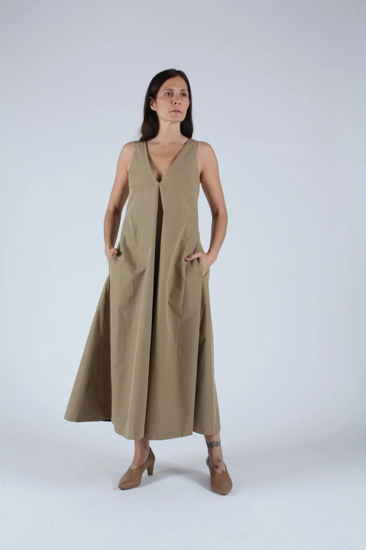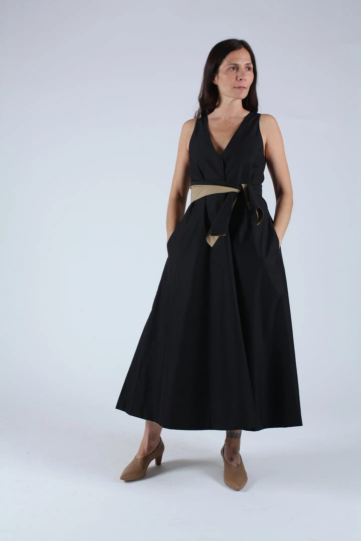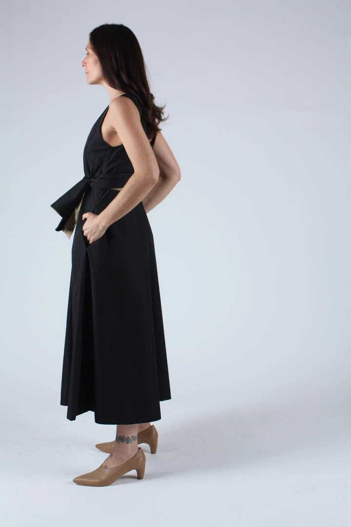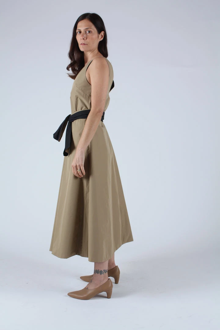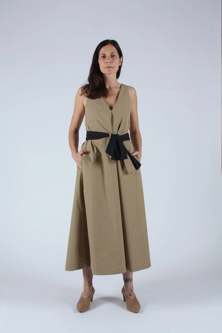 Reversible mid length dress constructed from an airy Japanese cotton blend. V neck front and back, side pockets and full sweeping skirt. Comes with reversible self belt.Â