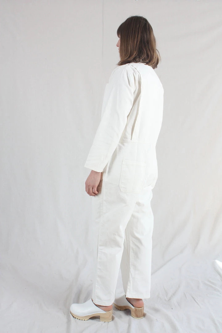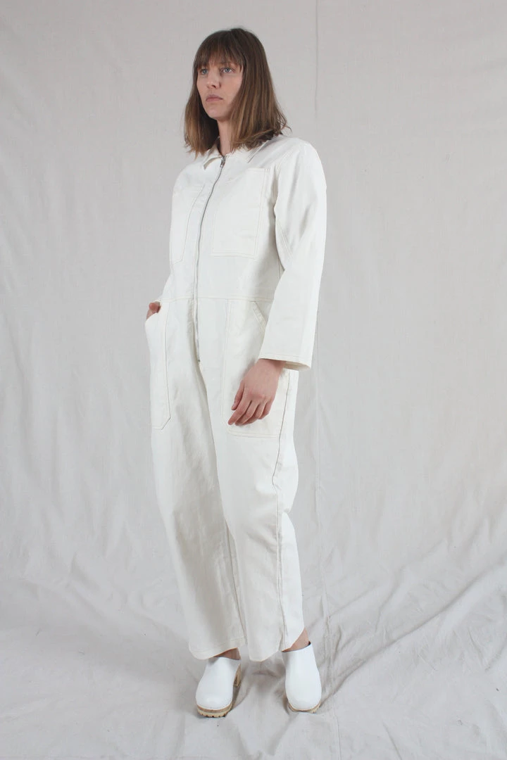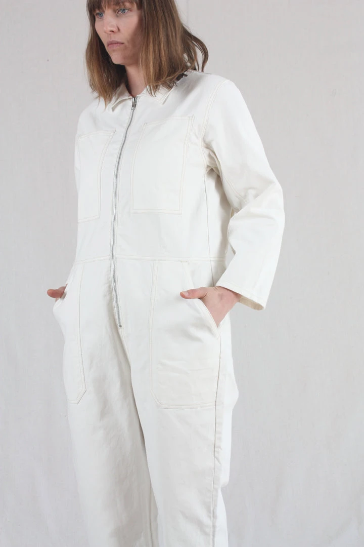 The Dominic Boilersuit has a relaxed fit and a slightly tapered leg. With 3/4 length sleeves. Large utility style pockets and contrast stitching throughout, and a silver front zip.