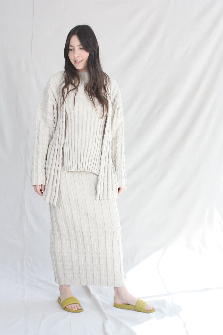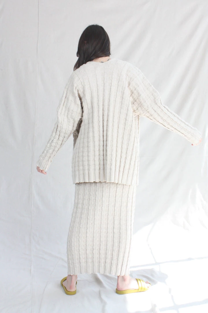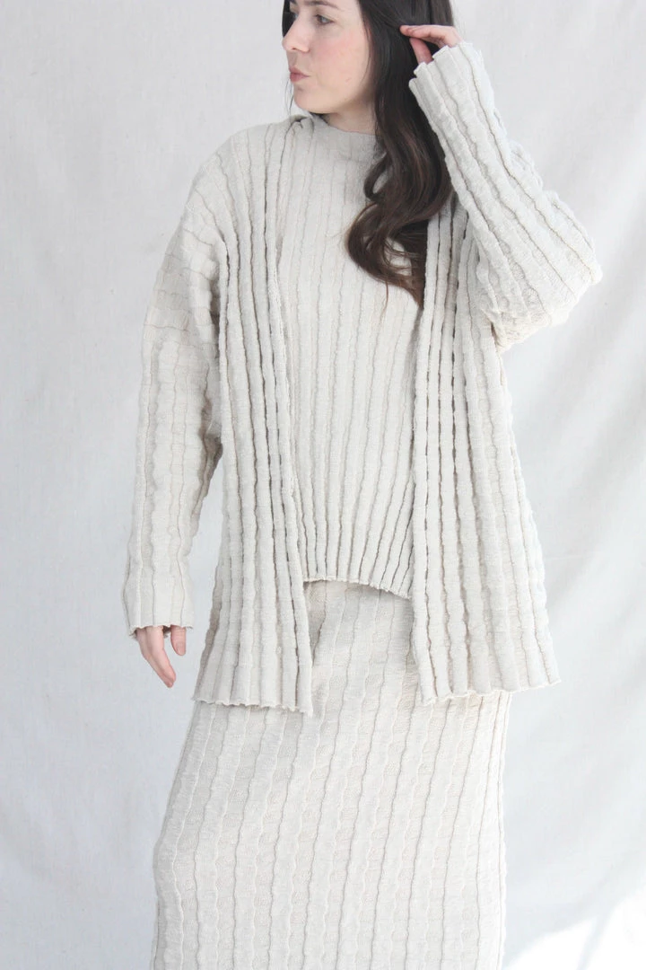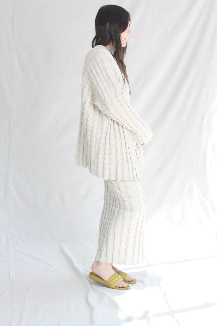 Open front cardigan with an irregular slubbed texture. Wide corrugated rib knit with subtle stretch.