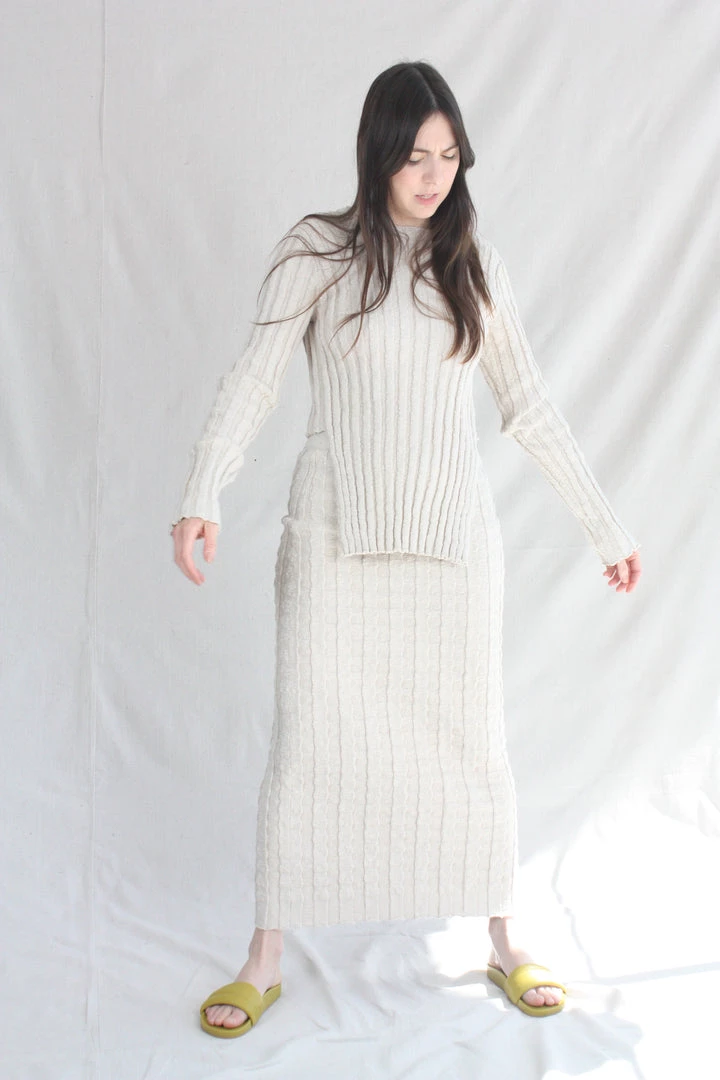 Column skirt in with an irregular slubbed texture. Puckered rib pattern with subtle stretch. Elastic waist.