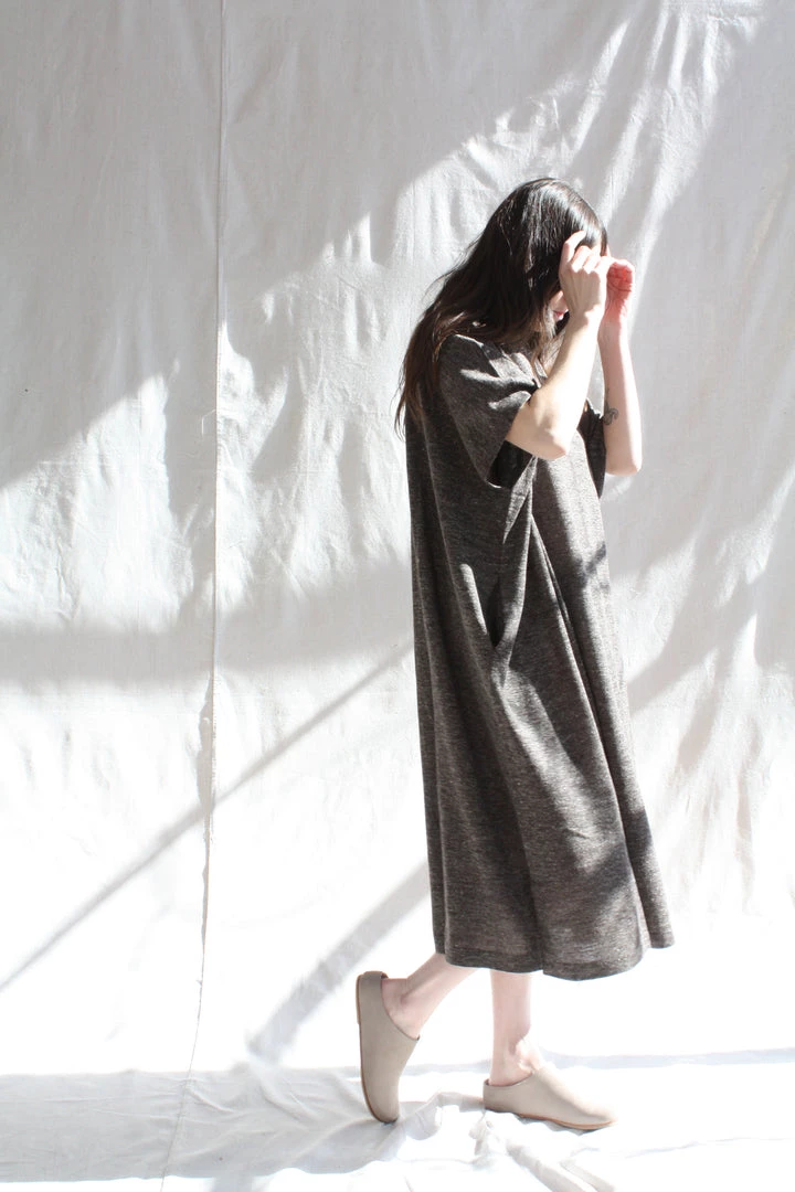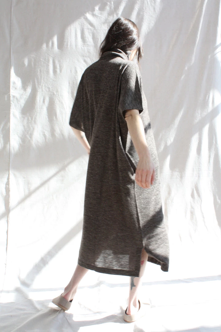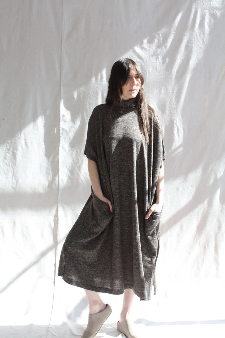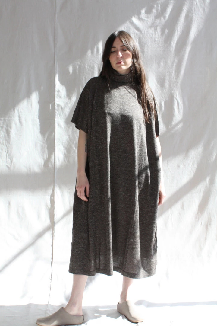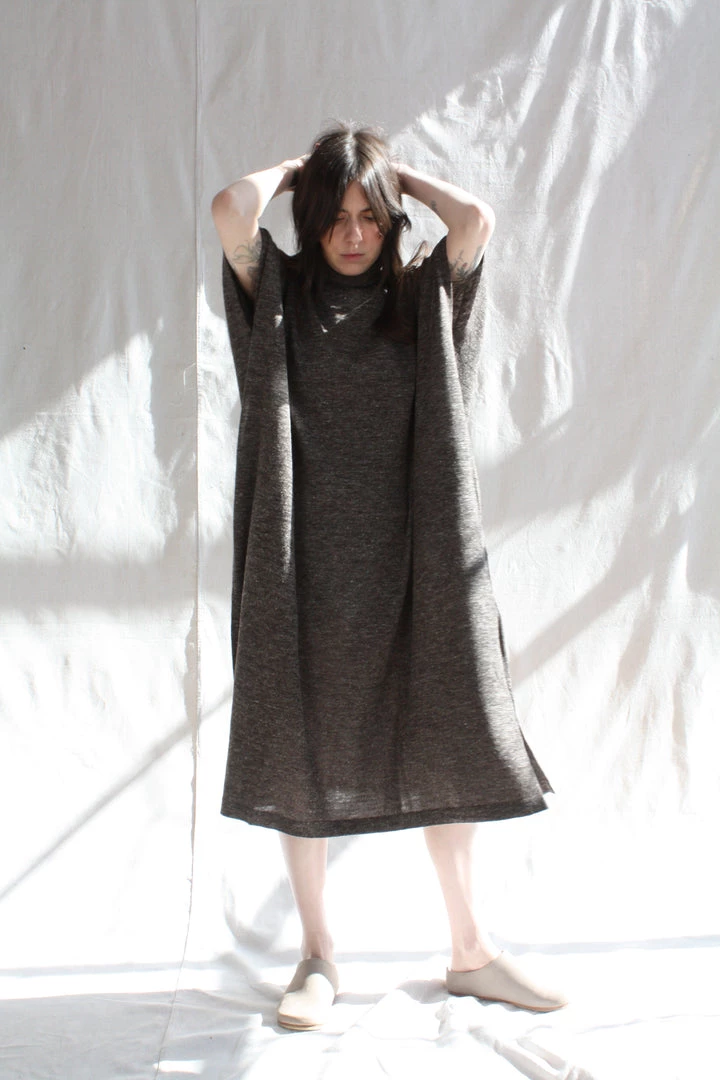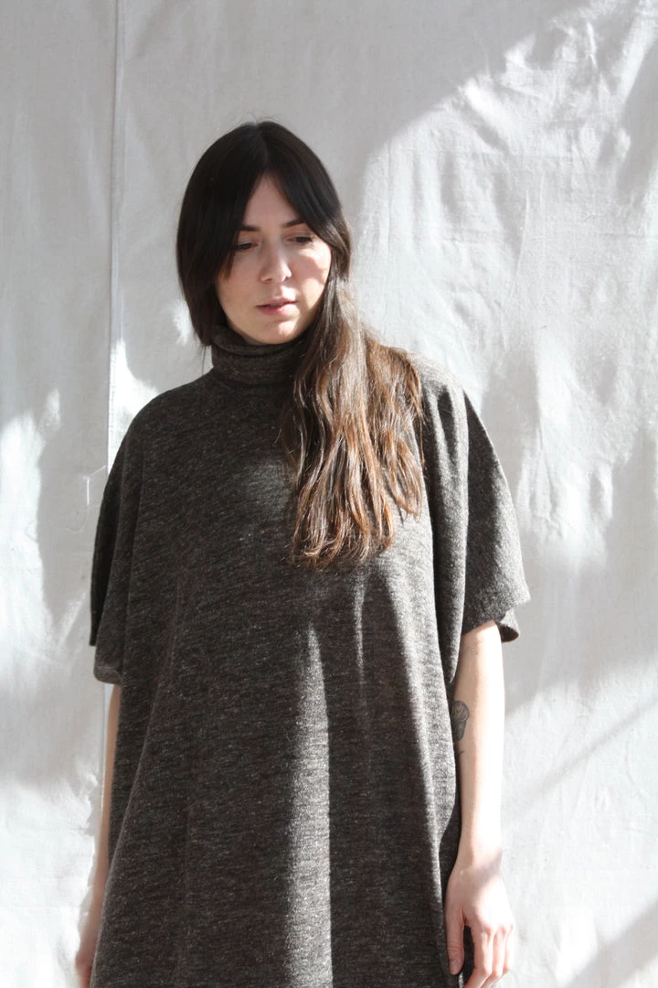 Oversized, draped caftan with a structured turtleneck in a fine weight alpaca, linen with a washed finish. Side slit.