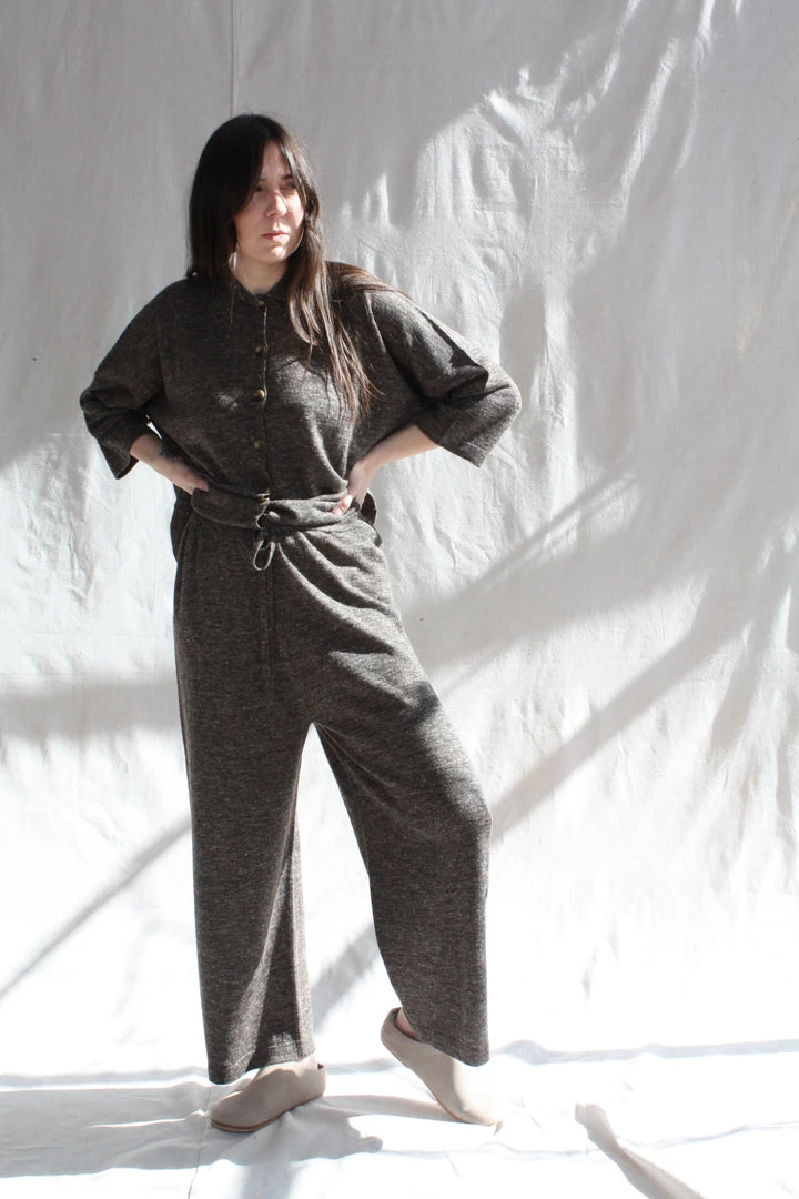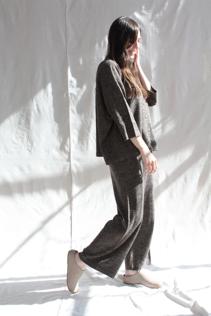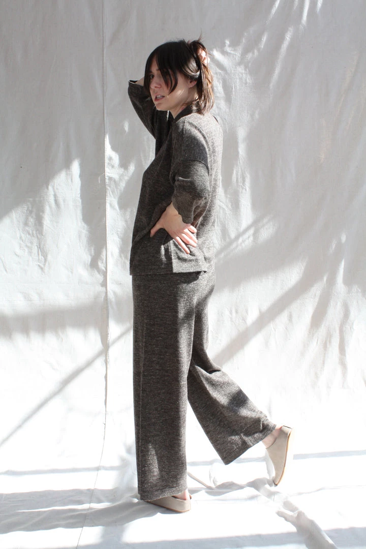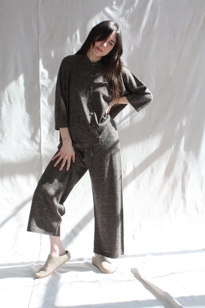 Fine weight baby alpaca and linen wide leg pant. Elastic waist with drawstring. Washed finish.