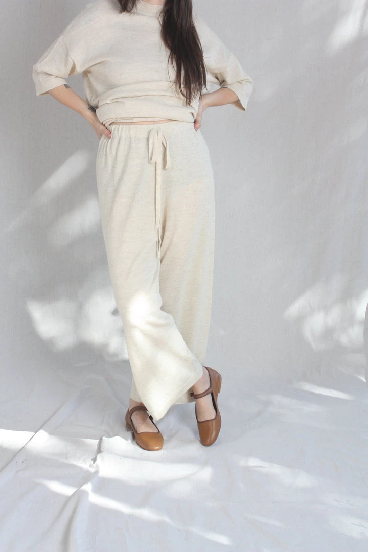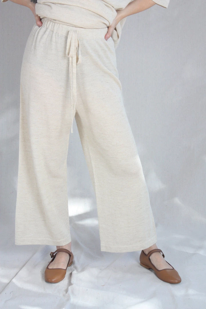 Fine weight baby alpaca and linen wide leg pant. Elastic waist with drawstring.