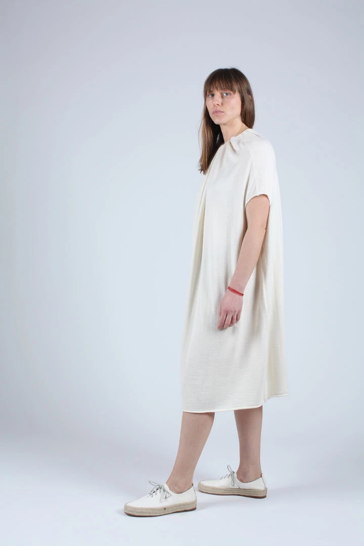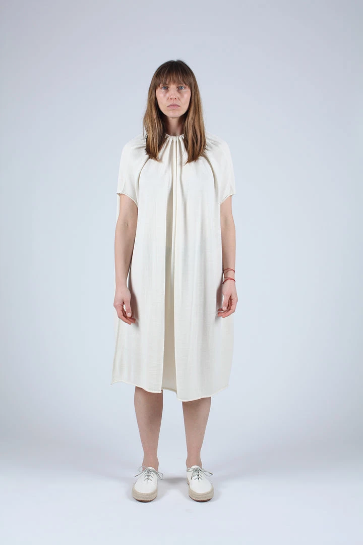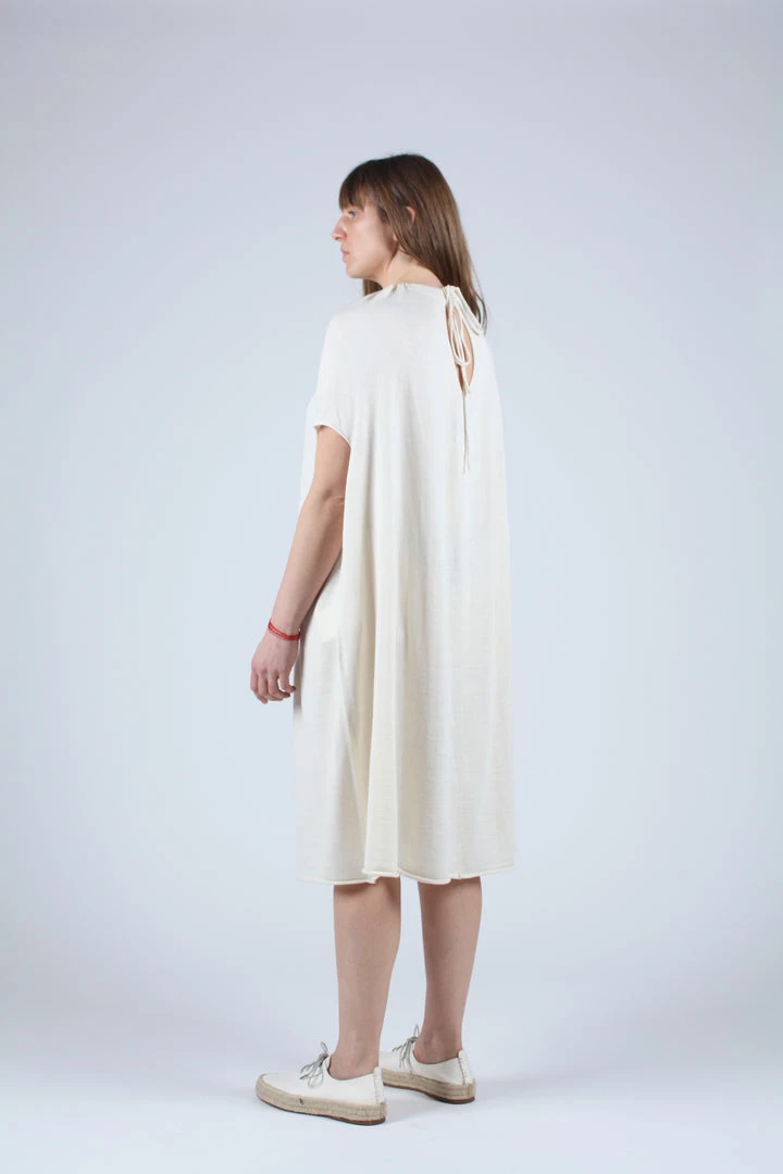 Gestural loose silhouette with an adjustable drawstring neckline. Integral fashioning and slit armholes.