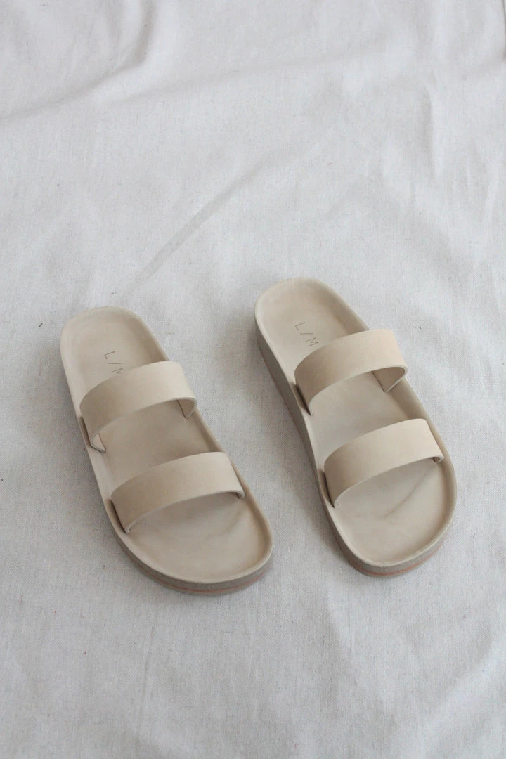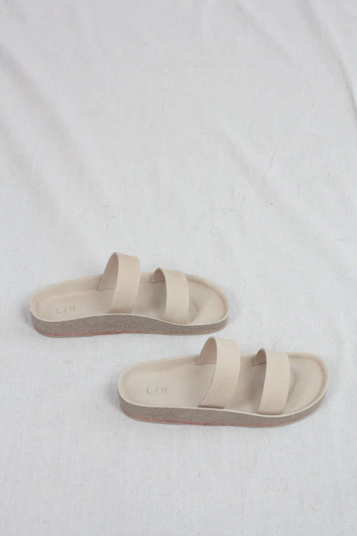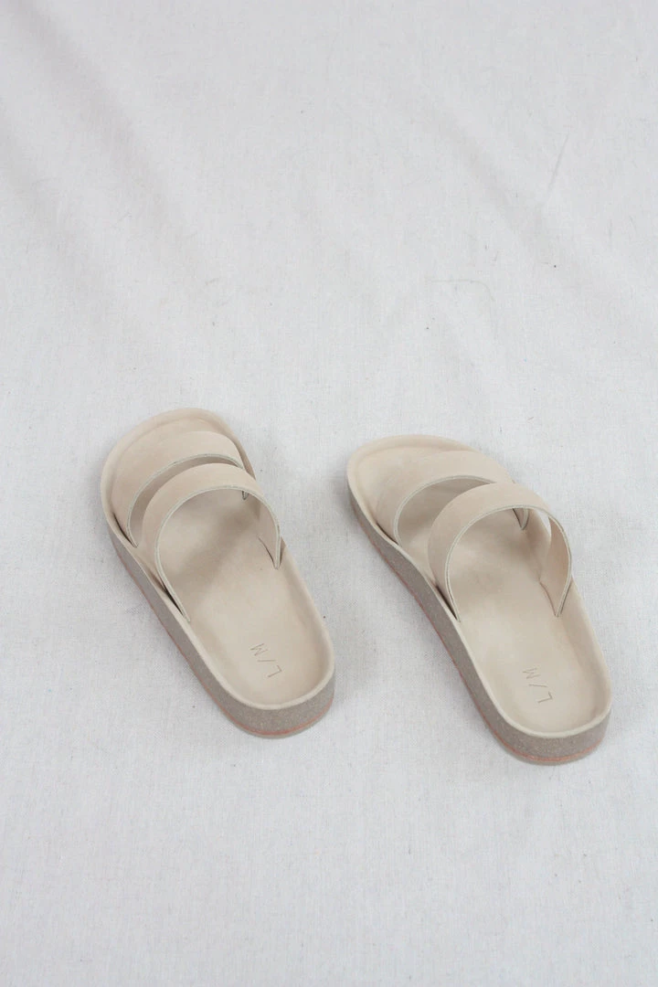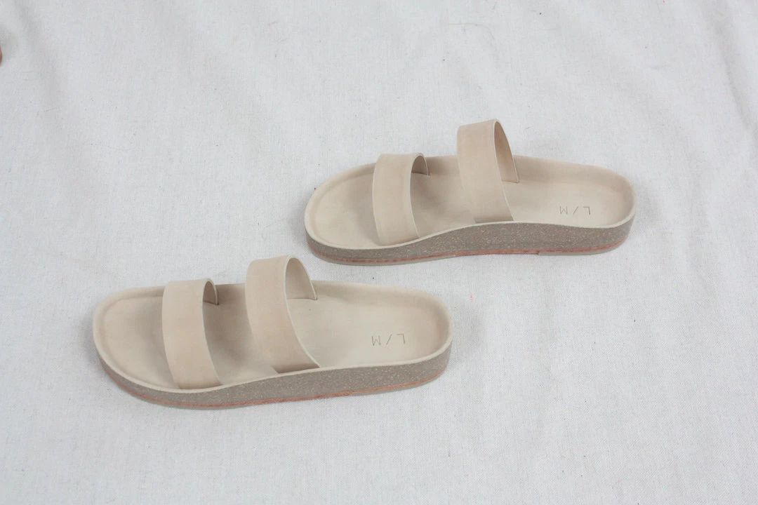Double band raw vegetable tanned leather upper. Hand skived. Exposed natural cork footbed. Natural leather sole.